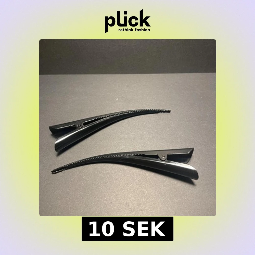Två stilrena svarta hårklämmor i plast med smal och böjd form. Perfekta för att hålla håret på plats när du stylar eller fixar frisyren. Enkel design som passar till alla hårtyper och är lätt att använda. Säljer för använder inte