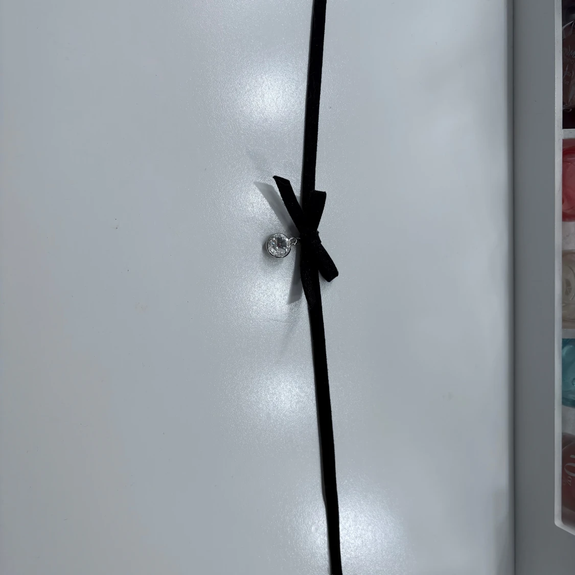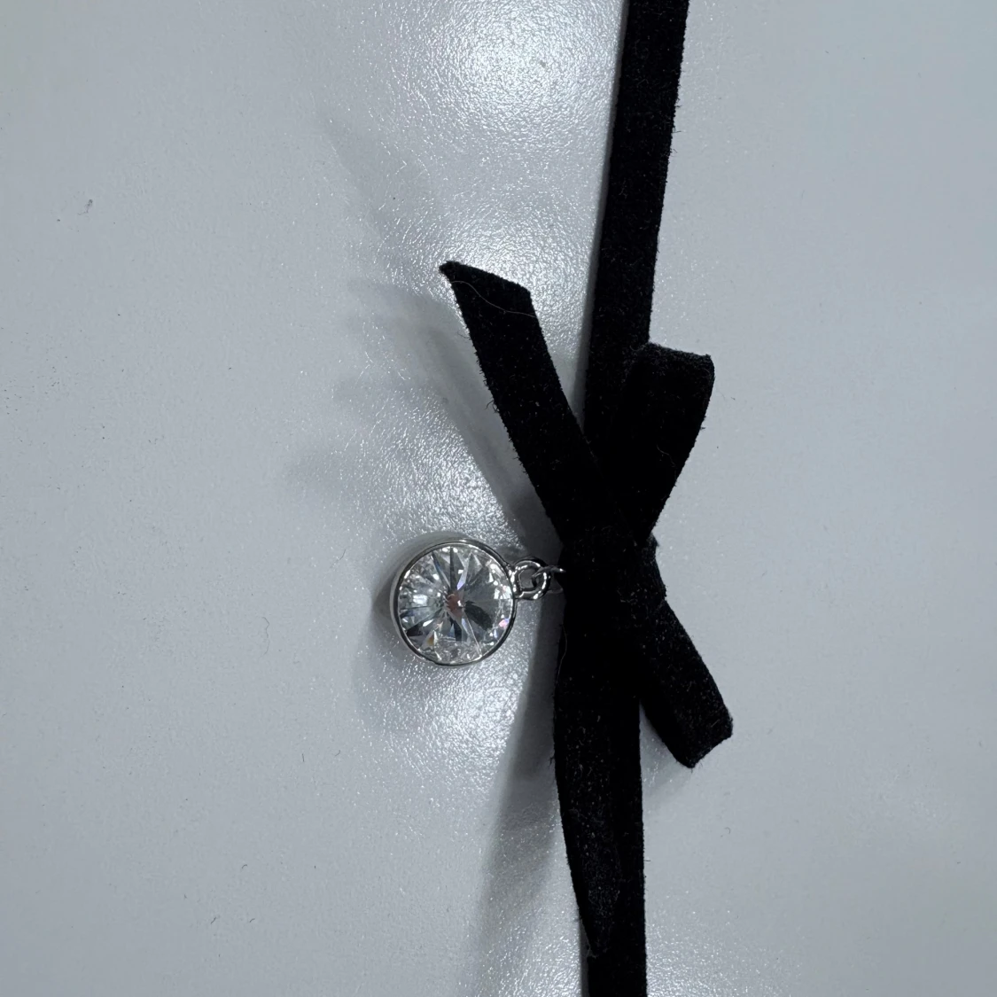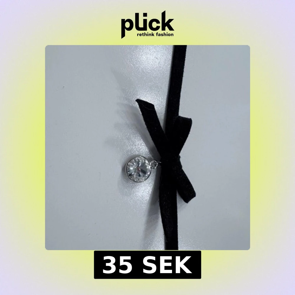 Snygg choker med ett smalt svart band i sammet och en glittrande rund sten i silverinfattning. Bandet knyts i en rosett framtill för en extra detalj. Perfekt för att lyfta din outfit.