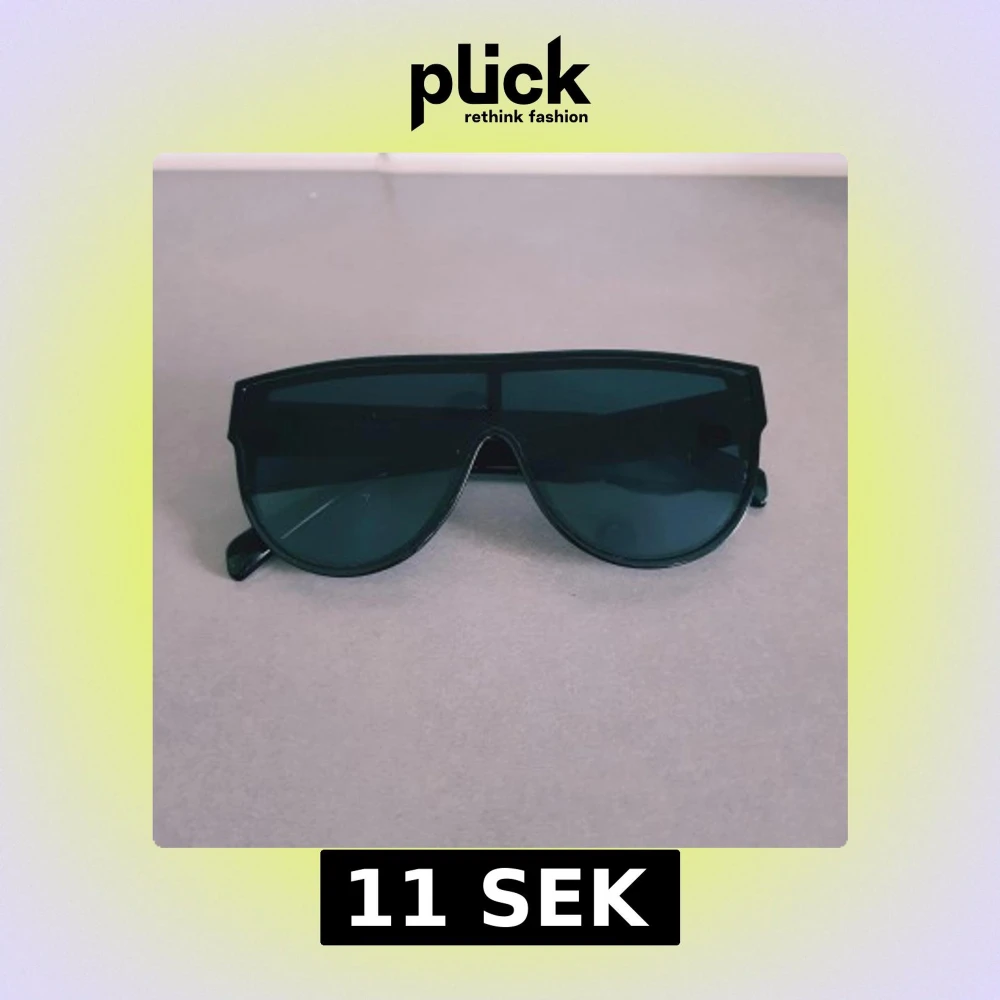 Snygga svarta solglasögon med breda bågar och shield-formade linser. De har en modern, futuristisk vibe och passar perfekt om du vill sticka ut. Tillverkade i blank plast med helsvarta glas och markerad ram. Helt & fint skick