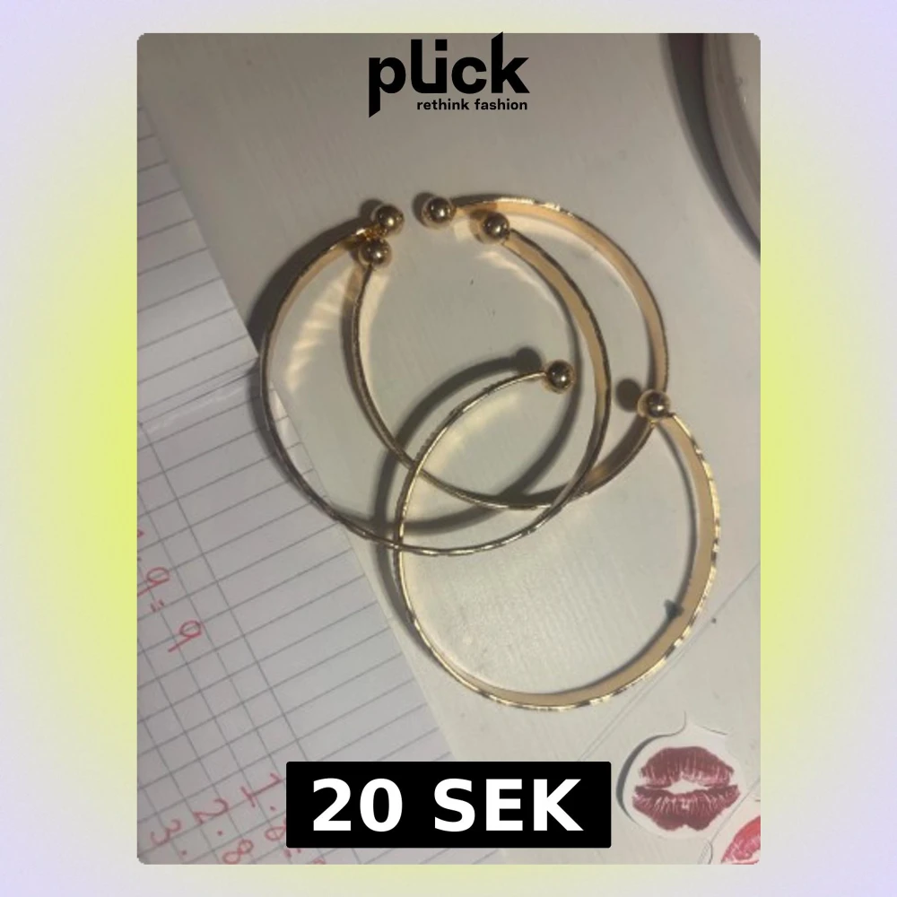 Säljer tre snygga guldiga armband i metall med graverade mönster och kulor i ändarna. Armbanden är öppna och har olika detaljerade gravyrer som stjärnor och trianglar. Perfekta för att ge din outfit lite extra bling.