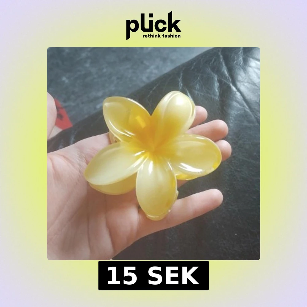 Superfin hårklämma i form av en stor blomma i gul plast. Perfekt accessoar för att ge din frisyr en söt och färgglad touch. Klämman har fem blomblad och en glansig finish som verkligen sticker ut.den är lite trasig‼️(kolla på bilen)