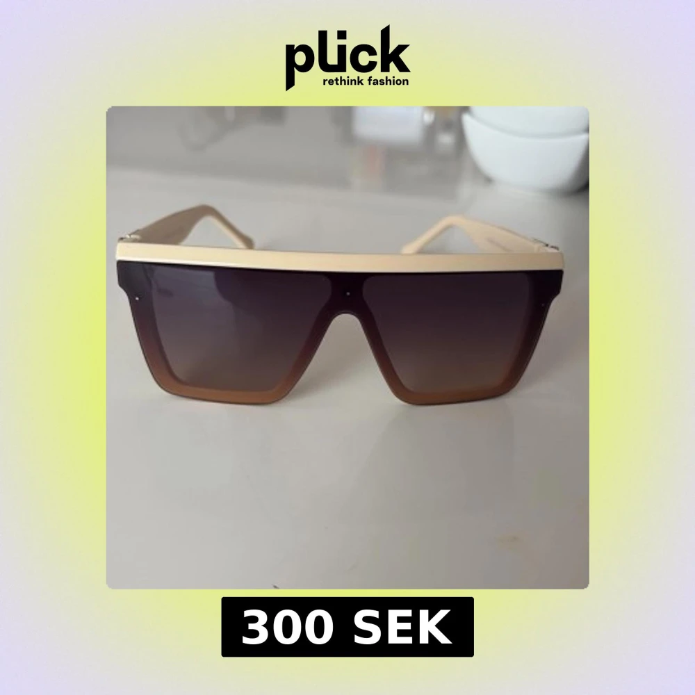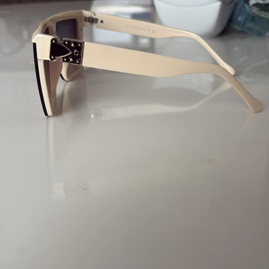 Snygga oversized solglasögon i beige med markerad guldig ram upptill och mörka, fyrkantiga linser. Sidorna har coola metalldetaljer i guld med nitar. Perfekt accessoar för en trendig look.