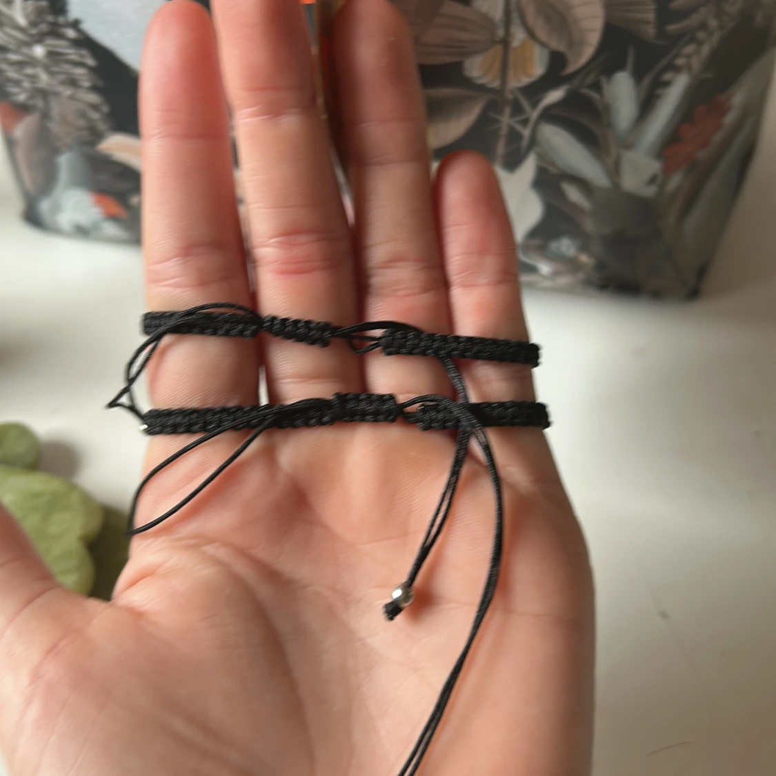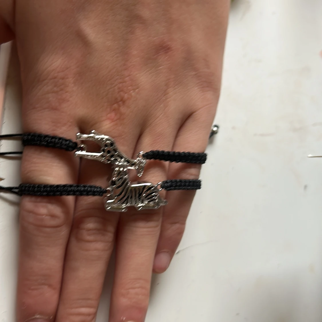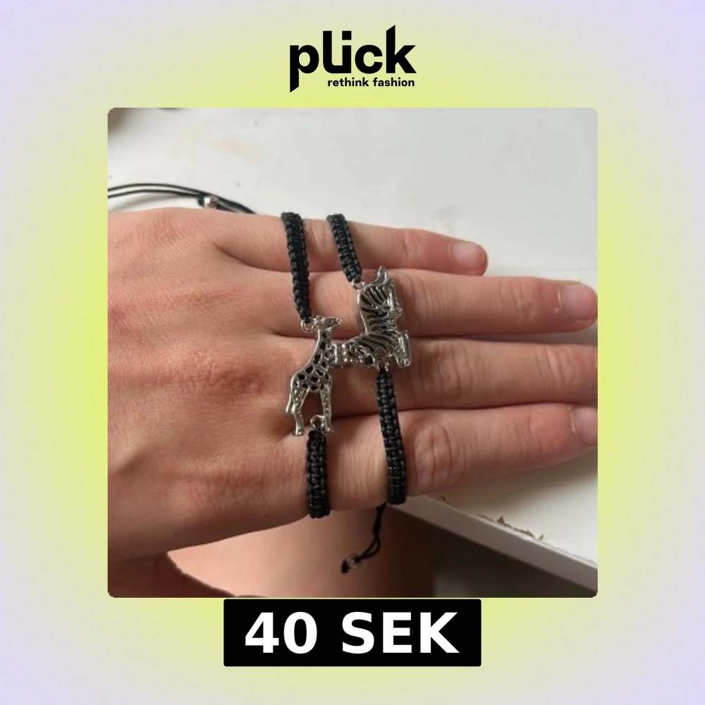 Två svarta armband med flätad design och silverfärgade detaljer i form av en giraff och en zebra. Djuren är stiliserade och ger armbanden en cool och unik vibe. Justerbara snören gör att de passar de flesta handleder. Perfekt för dig som gillar djur och vill sticka ut.
