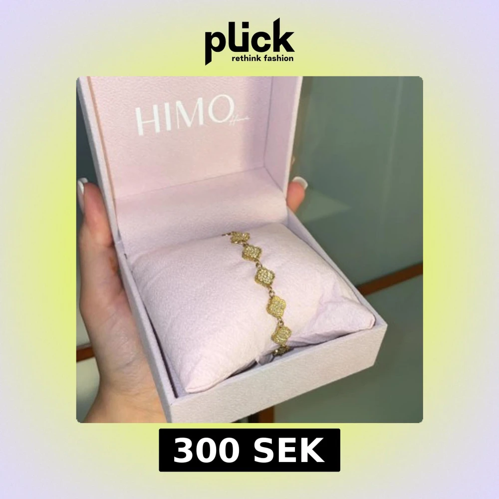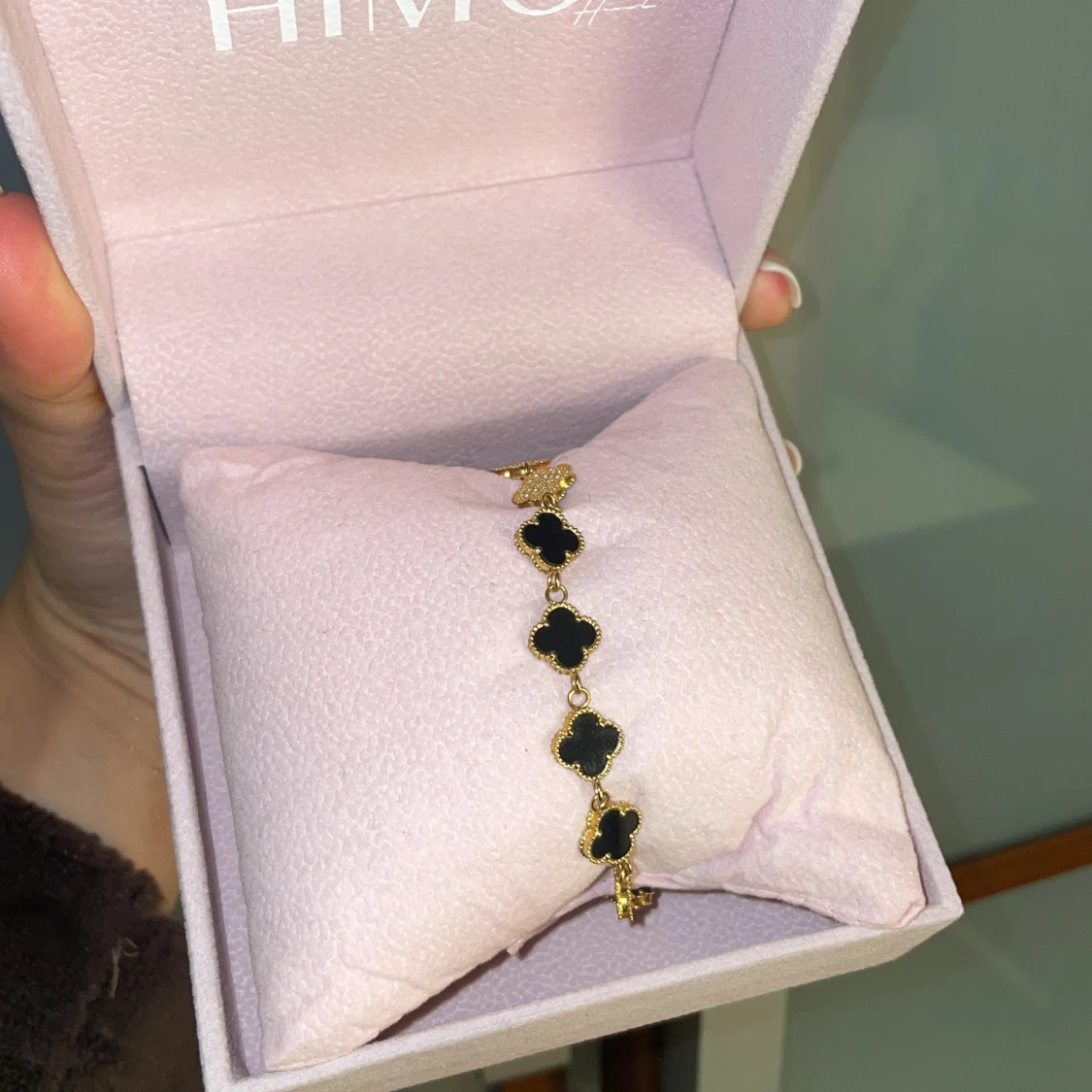Ett armband från HIMO, i guldton. Det ena sidan har glittrande fyrklöverformade länkar med små stenar, den andra sidan har svarta fyrklöver i guldinfattning. Perfekt accessoar för att lyfta din outfit med en lyxig touch.