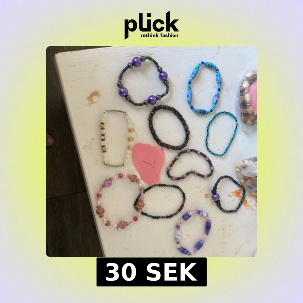 Säljer ett gäng unika pärlarmband i olika färger och former. Här finns armband med lila, blå, rosa, bruna och vita pärlor, vissa med glittriga detaljer och mönstrade pärlor. Perfekt för dig som vill ha något personligt och färgstarkt på handleden.