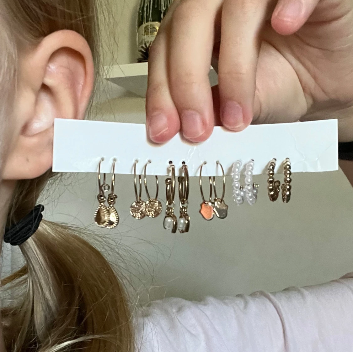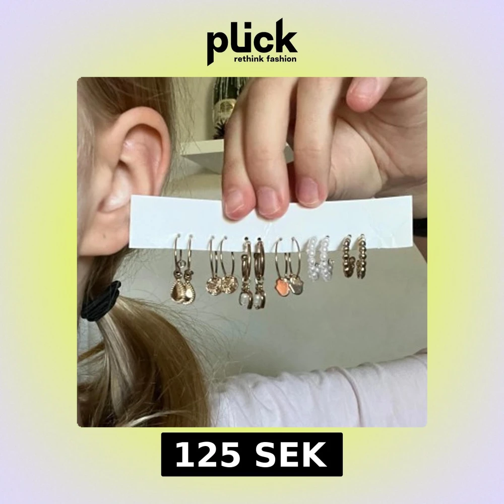 Säljer ett snyggt set med 6 par örhängen i olika stilar. Du får guldiga hoops med droppformade hängen, runda medaljonger, små pärlor, hjärtformade berlocker, samt två par med vita pärlor och guldiga kulor. Perfekt för att mixa och matcha till din egen vibe.
