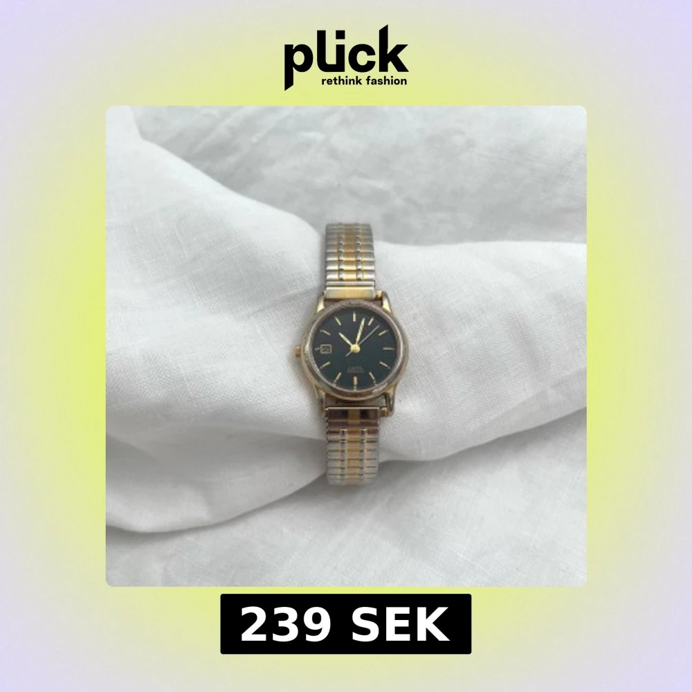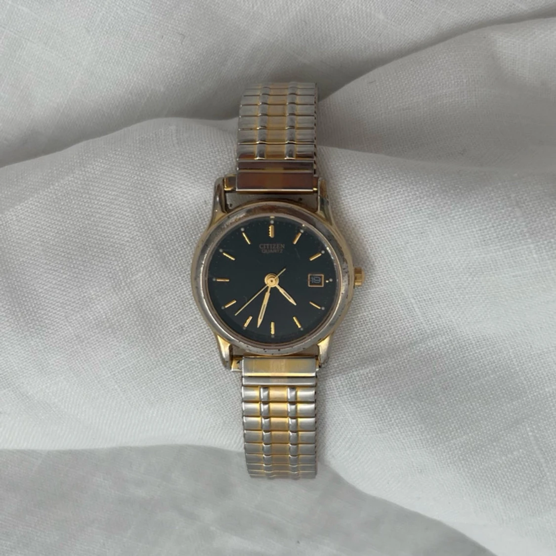 Klockan fungerar. Klockan Marie från märket Citizen är en guldfärgad klocka med svart urtavla och datumvisning. Klockan har ett flexibelt metallarmband som ger en klassisk look. Perfekt för dig som gillar stilrena accessoarer Omkrets yttre :19,5cm Omkrets inre: 15,5cm Urtavlans bredd 25mm