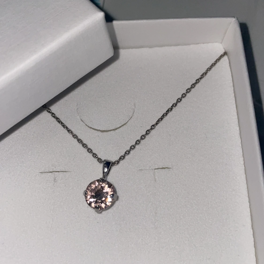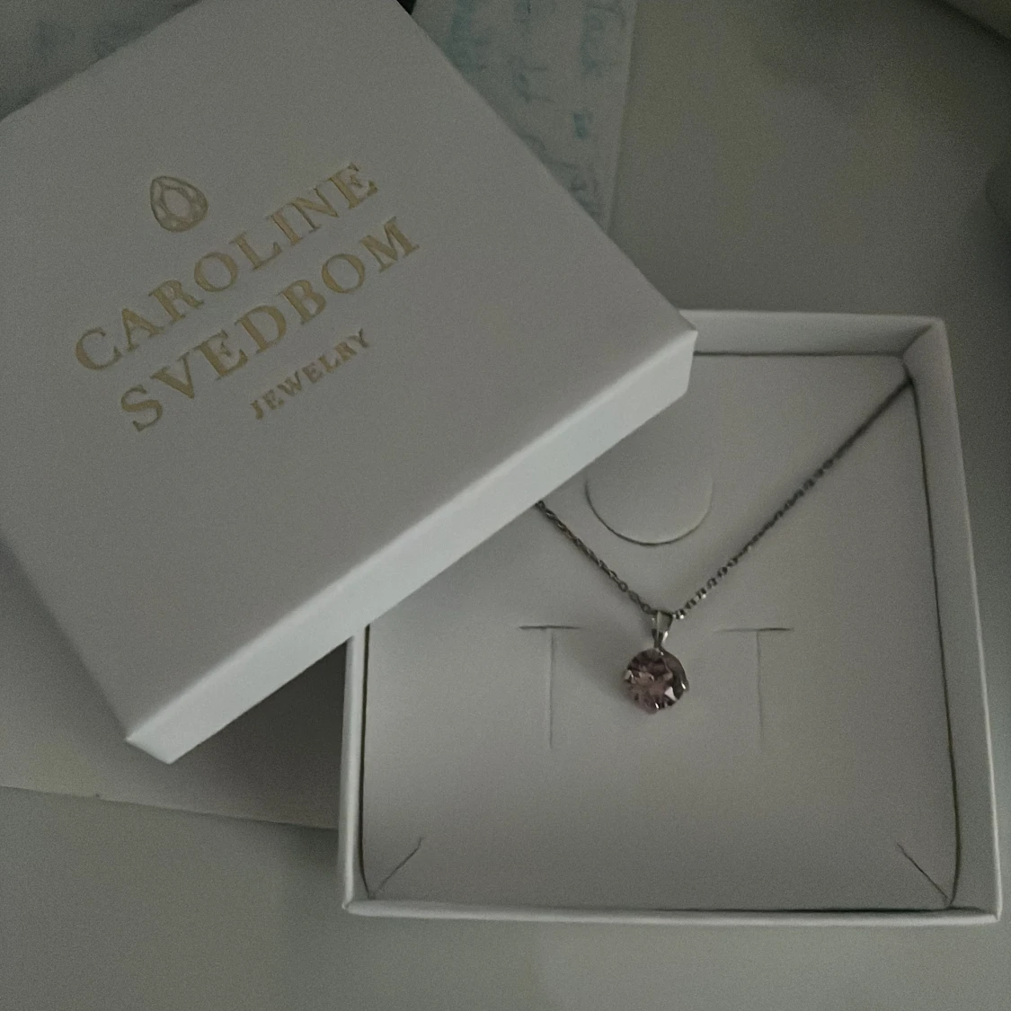 Supersnyggt halsband från Caroline Svedbom med en rund, ljusrosa kristall som hänger i en tunn silverfärgad kedja. Perfekt för dig som gillar stilrena smycken med en touch av färg. Kommer i original ask.