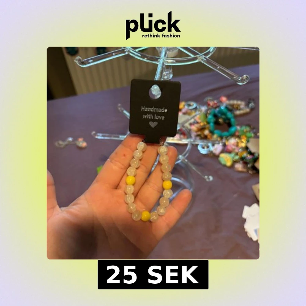 Ett handgjort armband med runda pärlor i transparent vitt och inslag av klargula pärlor. Armbandet har en enkel och lekfull design som passar perfekt för att liva upp din stil. Säljs på svart kort med texten 'Handmade with love'.