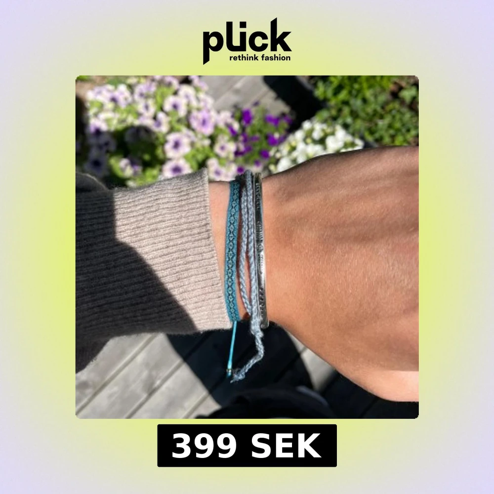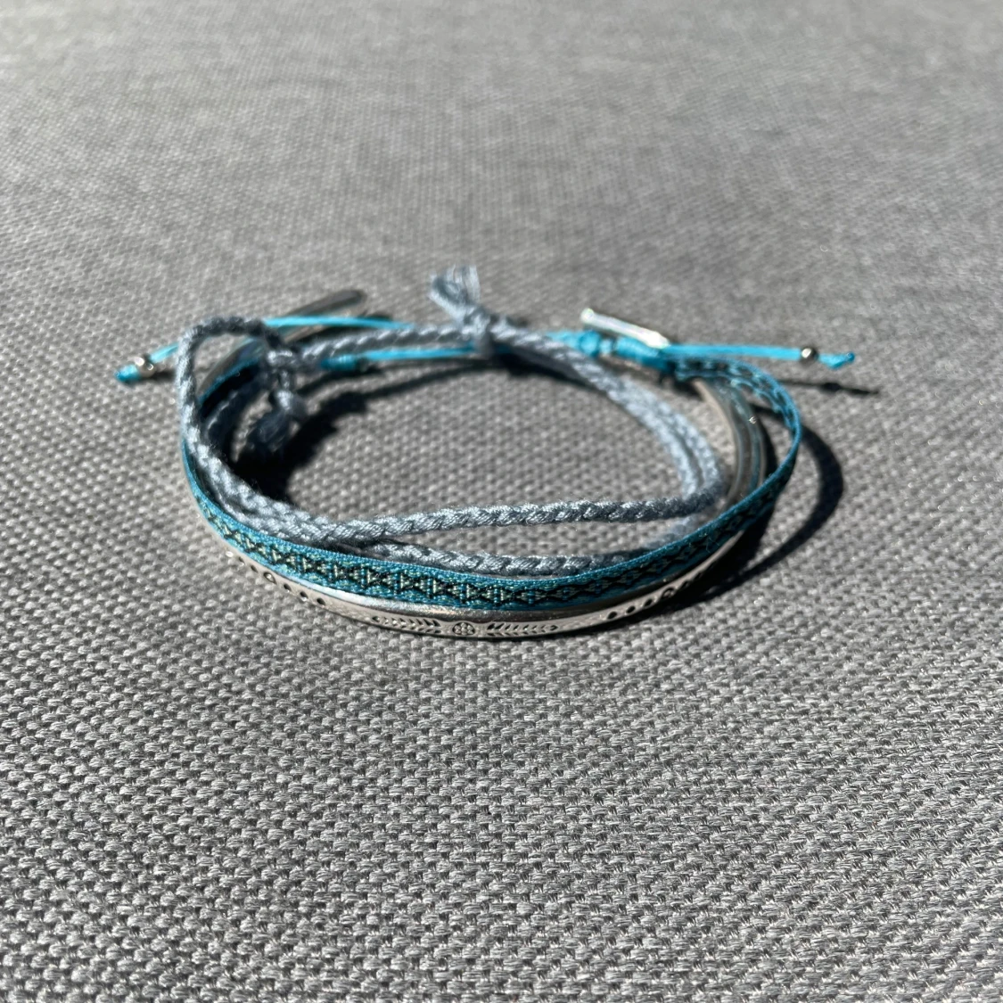 Säljer ett snyggt armband set med tre olika band: ett silverfärgat smalt metallarmband med ingraverad text, ett blått och grått flätat band samt ett blått band med svart mönster. Perfekt för dig som gillar att mixa olika stilar och färger.