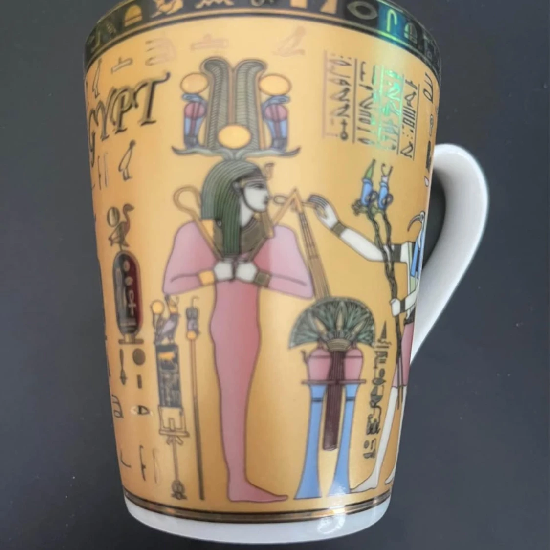Bilderna visar en mugg med motiv från forntida Egypten, inklusive hieroglyfer och färgstarka illustrationer av egyptiska gudar och faraoner. Muggen har detaljerade och dekorativa mönster som ger en känsla av historia och mystik. Ingen bok syns på bilderna.