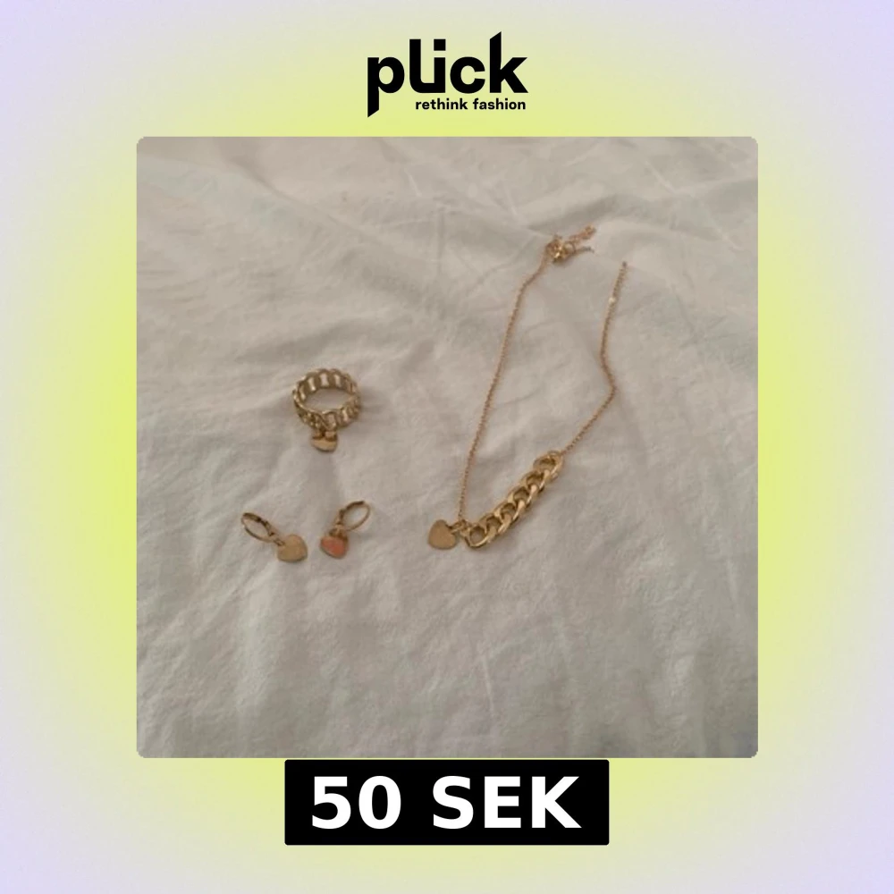 Snyggt smyckeset i guld med chunky ring, halsband och örhängen, alla med små hjärtanhängen. Perfekt för dig som gillar detaljer och vill ha ett matchande set. Kedjan på halsbandet är delvis grov och örhängena är små hoops med hjärtberlocker.