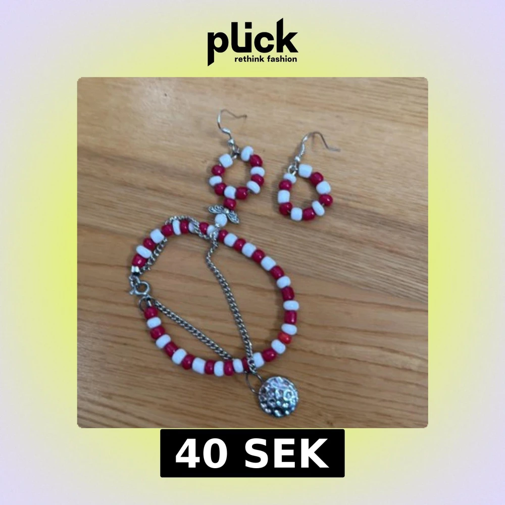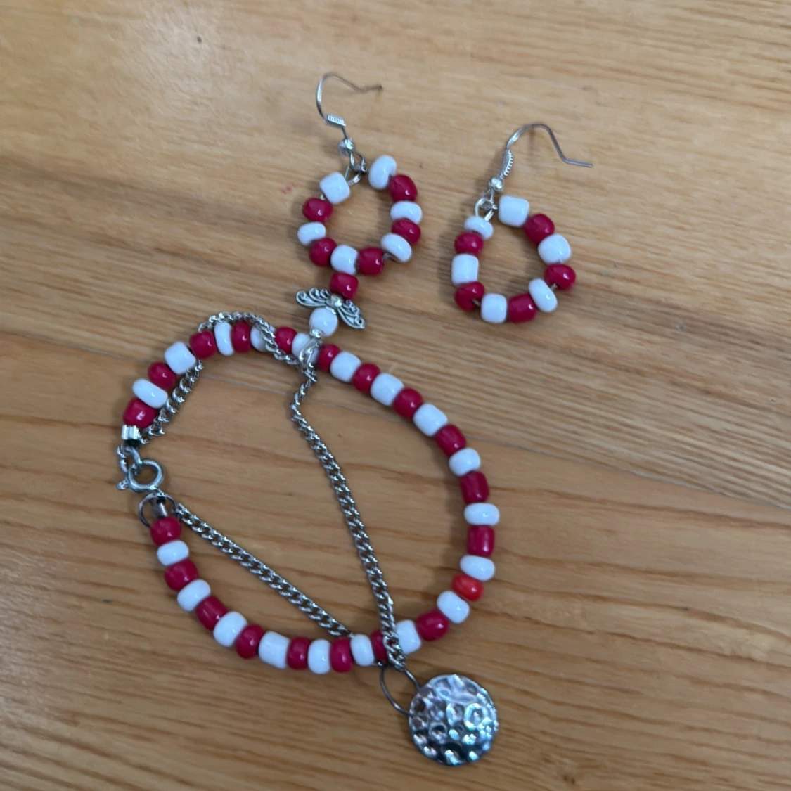 Säljer ett färgglatt smyckeset med armband och örhängen i runda former. Setet är gjort av röda och vita pärlor med silverfärgade detaljer och kedja. Armbandet har en cool rund berlock som extra detalj. Perfekt för dig som gillar att sticka ut med accessoarer!