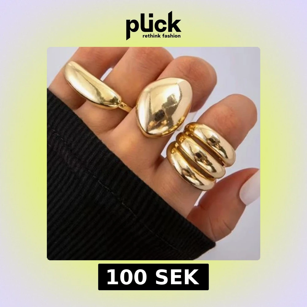 Säljer tre statementringar i guldig metall med olika former – en avlång, en droppformad och en med tredelad design. Perfekta för dig som vill sticka ut och ge din outfit en cool touch.