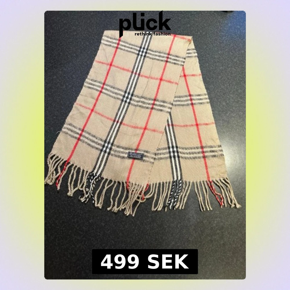Säljer en klassisk beige halsduk från Burberrys i 100% kashmir. Den har det ikoniska rutiga mönstret med svarta, vita och röda linjer samt fransar i kanterna. Perfekt accessoar för att höja din stil och hålla dig varm under kyliga dagar.