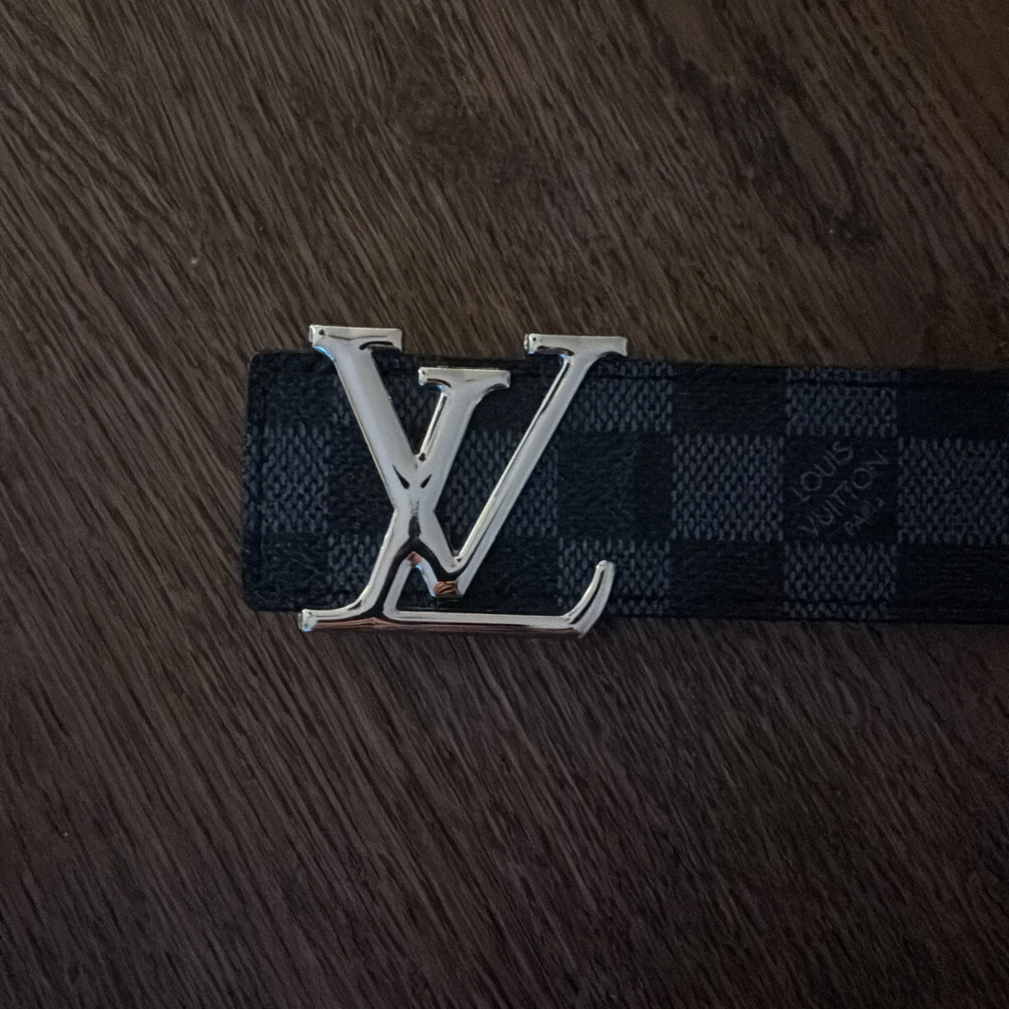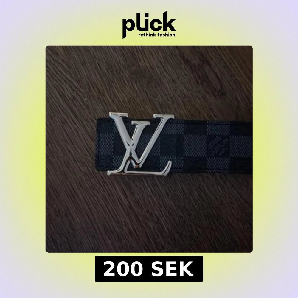 Rutigt bälte med silvrig text. 102 cm
