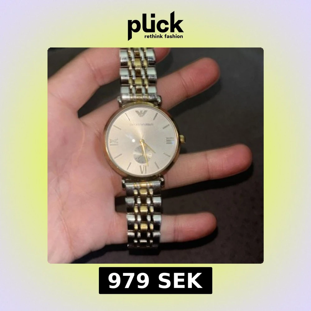 Stilren herrklocka från Emporio Armani med rund urtavla i silver och romerska siffror. Länkarmband i silverfärgat stål med gulddetaljer. Klassisk design med logotyp på urtavlan och viklås.