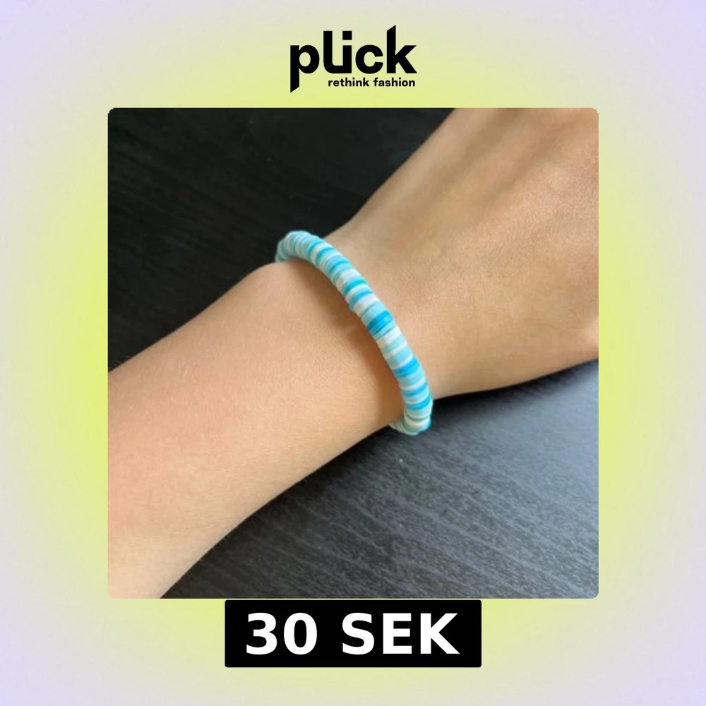 Säljer ett armband med platta pärlor i olika nyanser av blått och vitt. Armbandet har en enkel och fräsch design som passar perfekt till sommaren. Elastiskt band gör det lätt att ta på och av.🩵