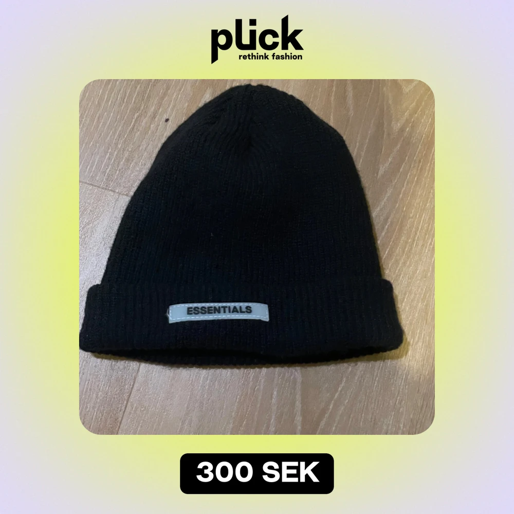 Säljer en stilren svart stickad mössa från Essentials. Den är perfekt för kalla dagar och har en enkel design med en uppvikt kant och en diskret logga framtill. Passar till alla outfits och håller dig varm hela vintern.
