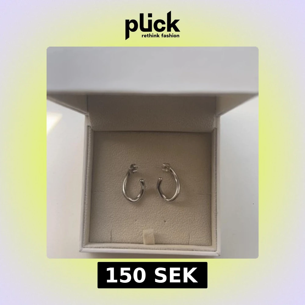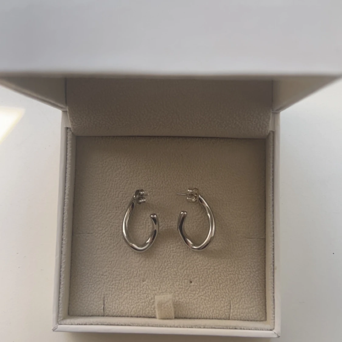 Säljer ett par silvriga örhängen med cool, böjd form. De är halvrunda och ser lite ut som en åtta på örat. Säljer då jag bytt från silver till guld smycken.