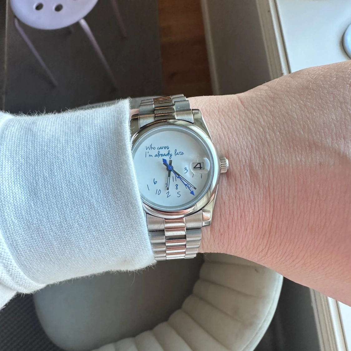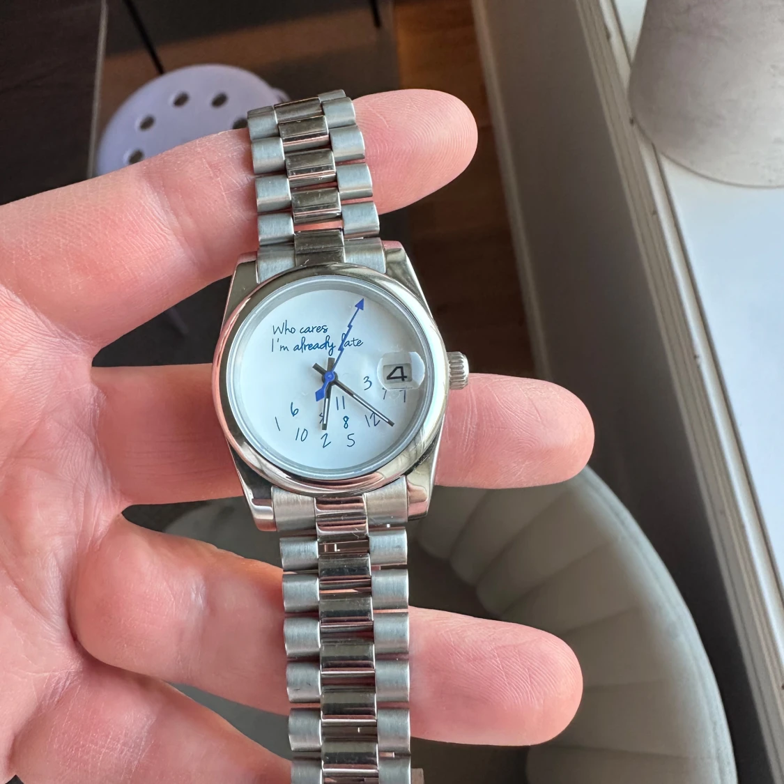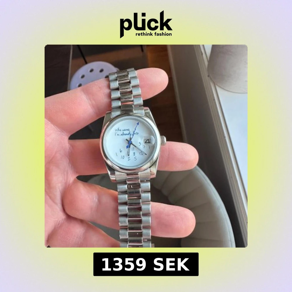 Seiko urverk nh35a, safirglas, presidentlänk. 'Who cares, I'm already late'. Klockan har en silverfärgad metallarmband och en vit urtavla med blå visare. Perfekt för den som vill ha en rolig och annorlunda accessoar. Aldrig använd.