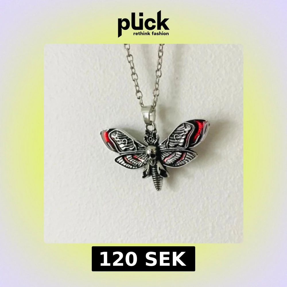 Unikt halsband med ett detaljerat fjärilshänge i silverfärg med röda inslag. Kedjan är av metall och har en klassisk länkdesign. Perfekt för att ge en edgy touch till din stil.