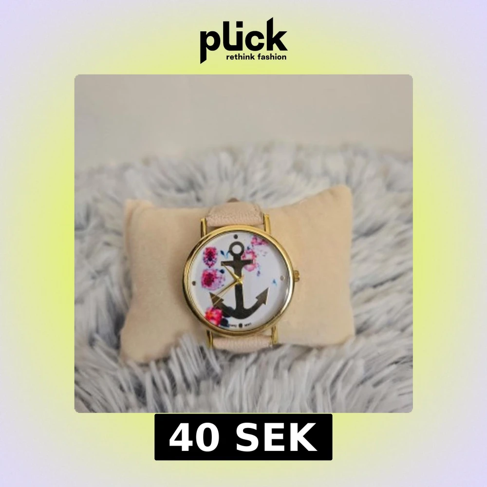 Snygg klocka med beige skinnarmband och en urtavla prydd med ett ankare och rosa blommor. Boetten är i guld och ger en elegant touch. Perfekt för den som gillar marina teman och stilrena accessoarer.