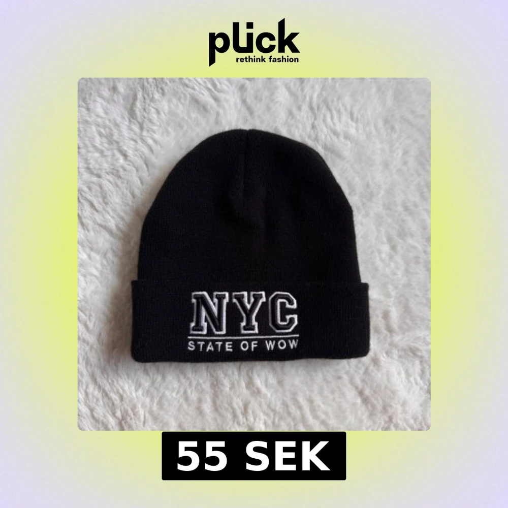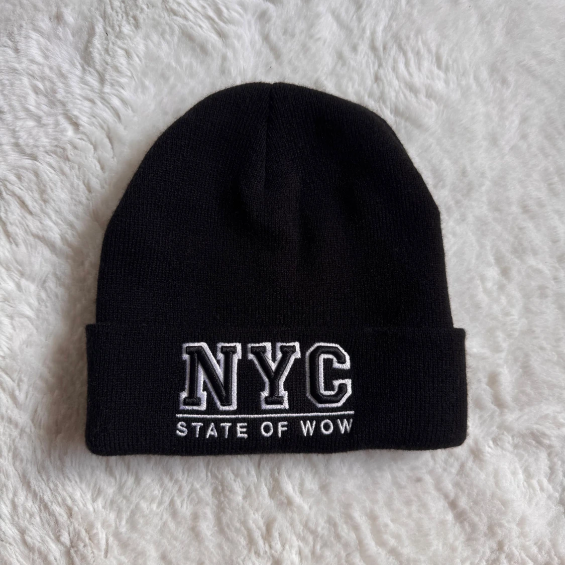 Svart ribbstickad mössa med uppvikt kant och vit broderad text 'NYC STATE OF WOW' framtill. Enkel och stilren design som passar till det mesta. Perfekt accessoar för kalla dagar.