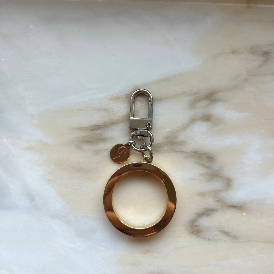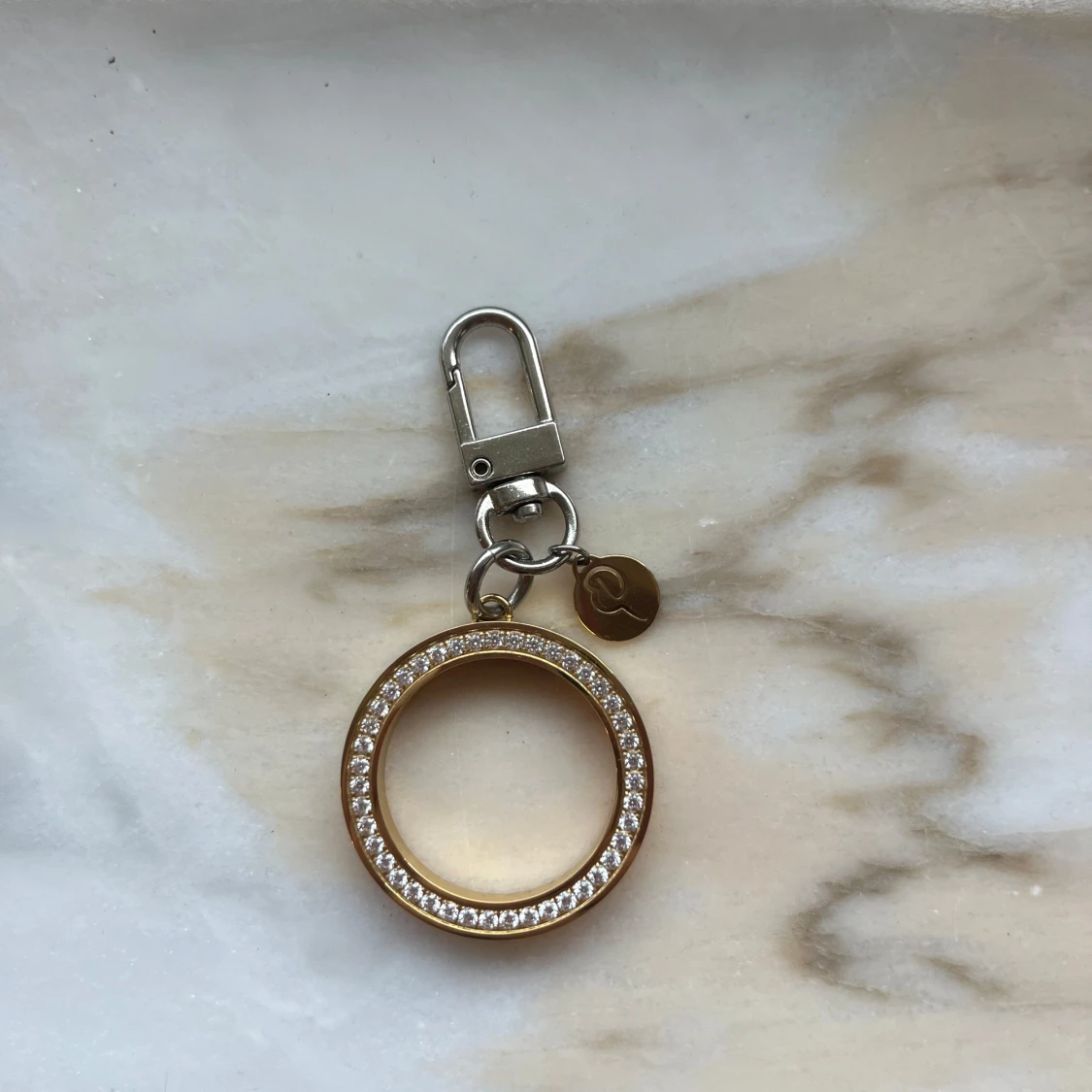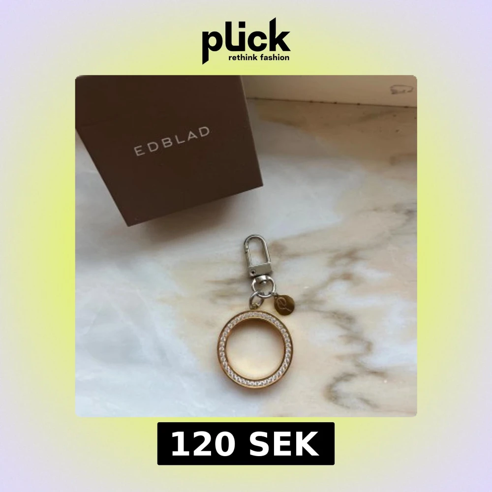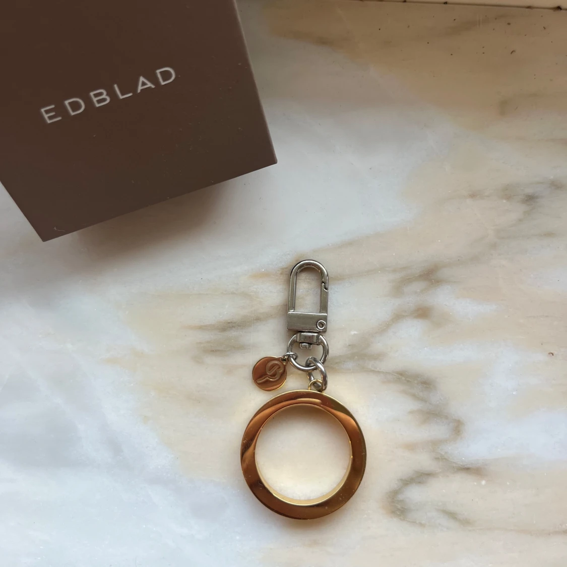 Nyckelring från märket Edblad. Både silver- och guldfärgat. Alla stenar är kvar. Den har aldrig blivit använd och har därmed inga defekter. Kan användas som nyckelring med också som bagcharm. Asken på bilden medföljer inte.