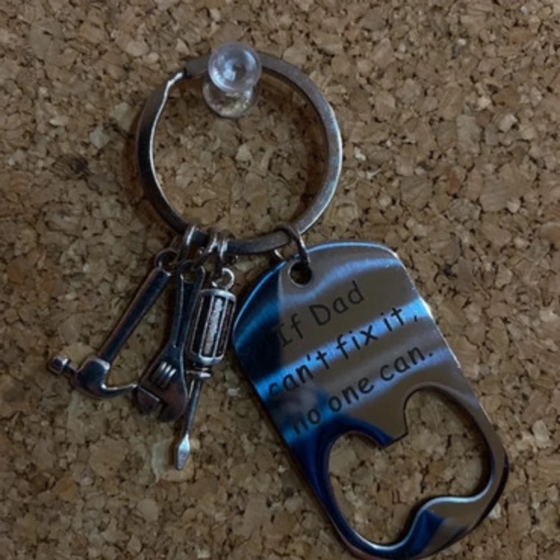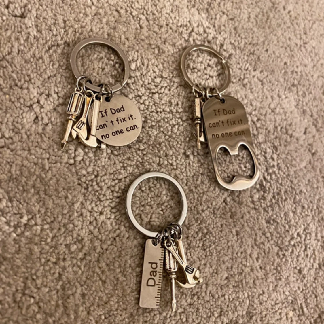 Säljer en cool nyckelring i silverfärgad metall med små berlocker som hammare, skruvmejsel och skiftnyckel. Perfekt present till pappa eller någon som gillar verktyg.