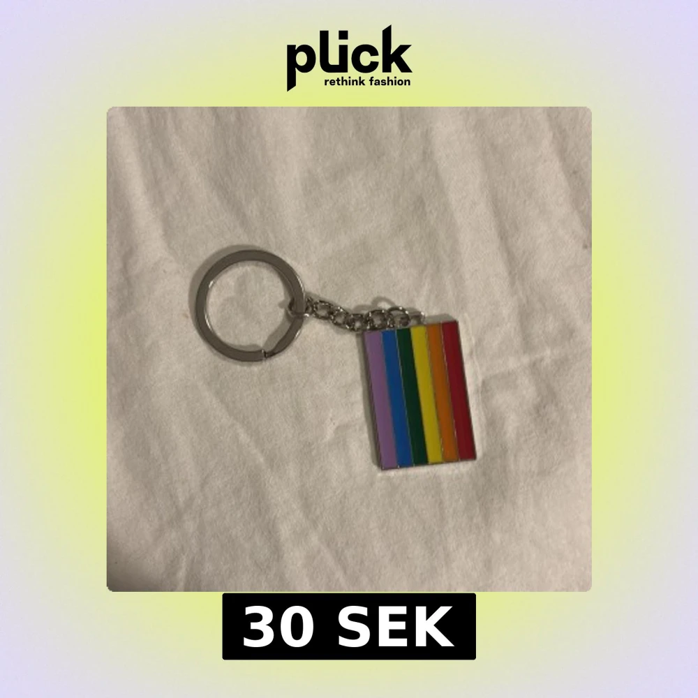 Säljer en snygg nyckelring med ett fyrkantigt hänge i regnbågens färger. Perfekt att hänga på väskan eller nycklarna för att visa lite extra färg och personlighet. Metallkedja och ring i silverfärg.