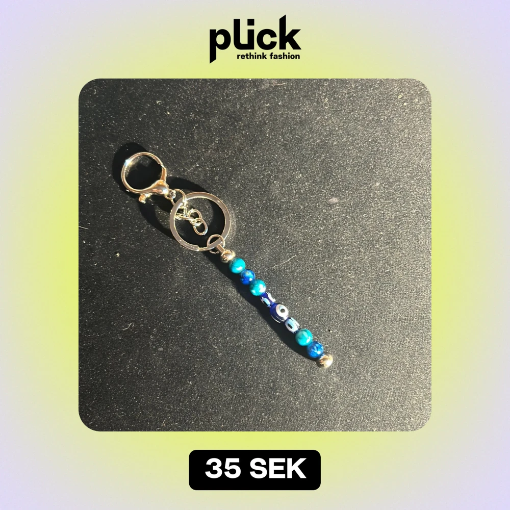 Snygg nyckelring med en rad av blå pärlor i olika nyanser och mönster. Den har en silverfärgad ring och karbinhake för enkel fastsättning. Perfekt accessoar för att ge dina nycklar lite extra stil!