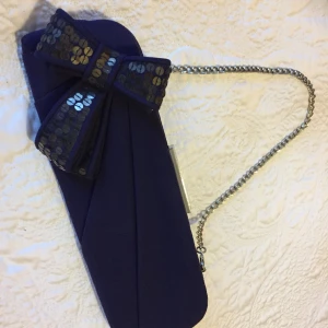 Afton väska. Karen Millen. Blå med elegant rosett. Silverfärgad kedja som axelrem. Ny, oanvänd. Matchar fest skor som säljes separat från Karen Millen.