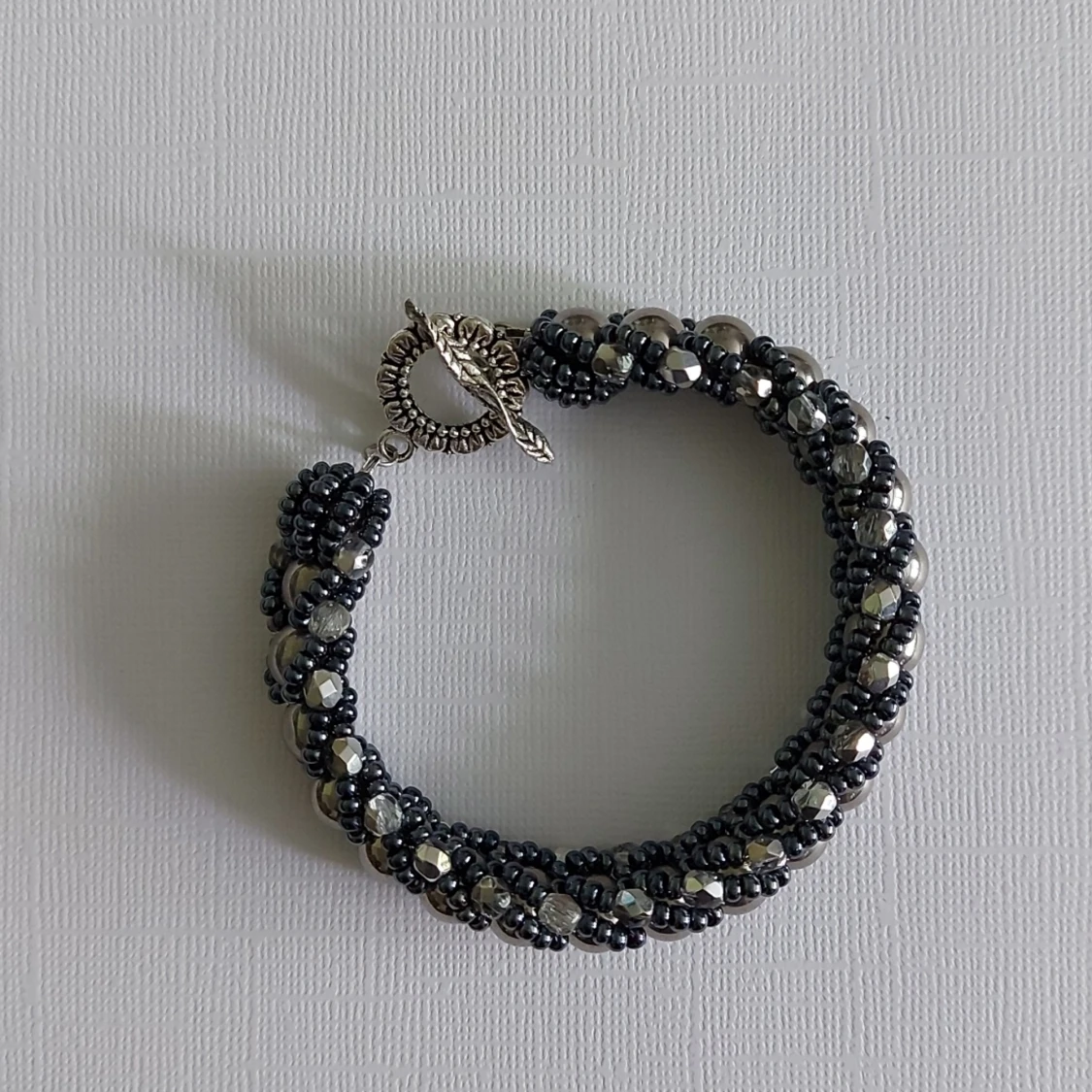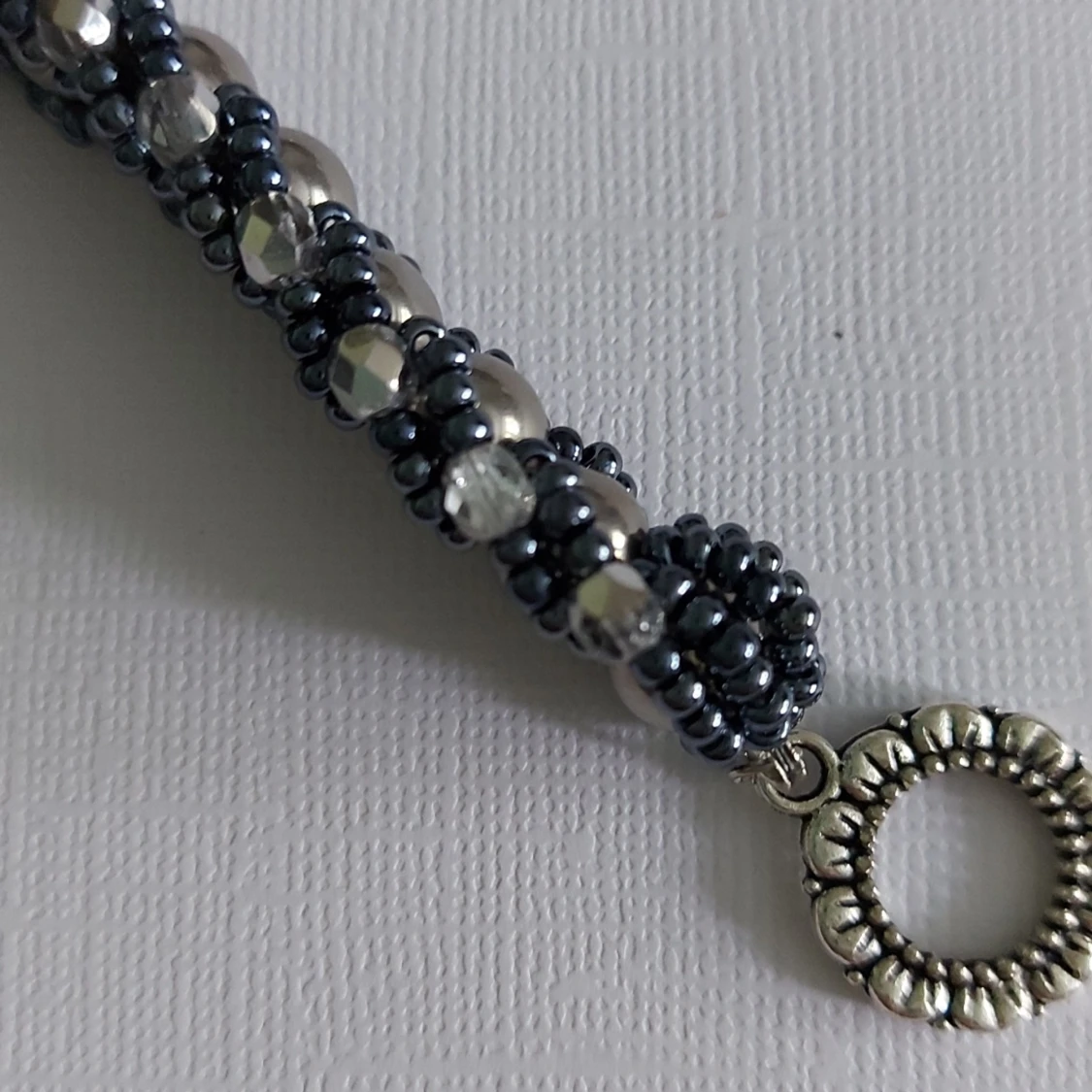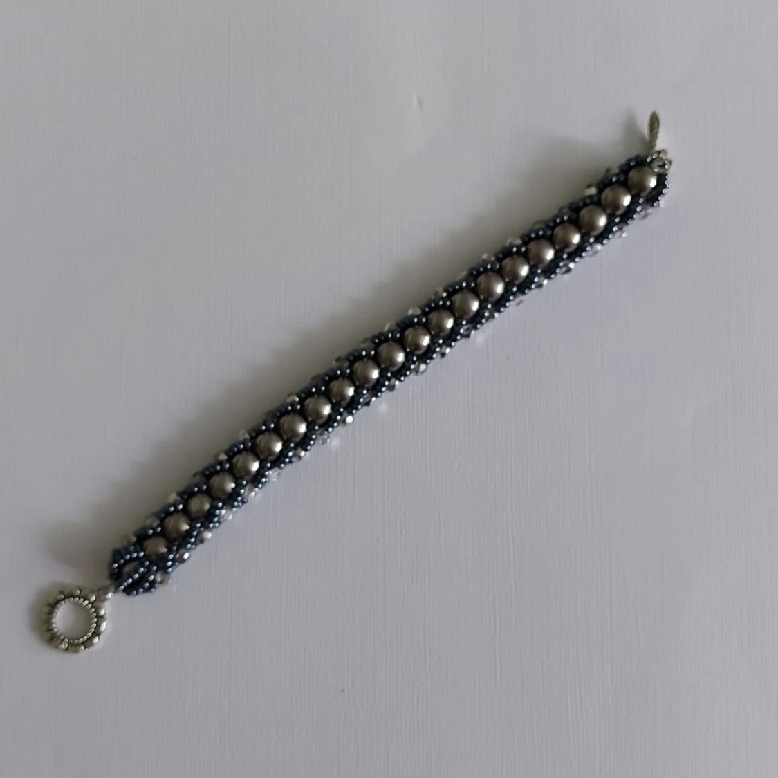 Armbandet har tyngd, är 19cm långt Bredden 1,5cm, tjocklek 1cm Den största pärlan i mitten 8mm med miyuki seed beeds och tjeckiska pärlor på sidorna, mönstret hämtat från Youtube Armbandet har togglelås Porto 13kr
