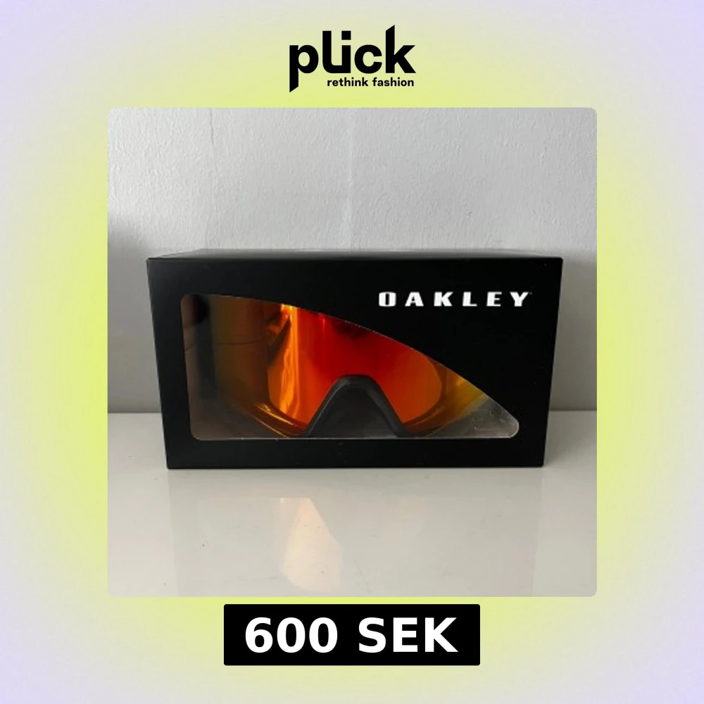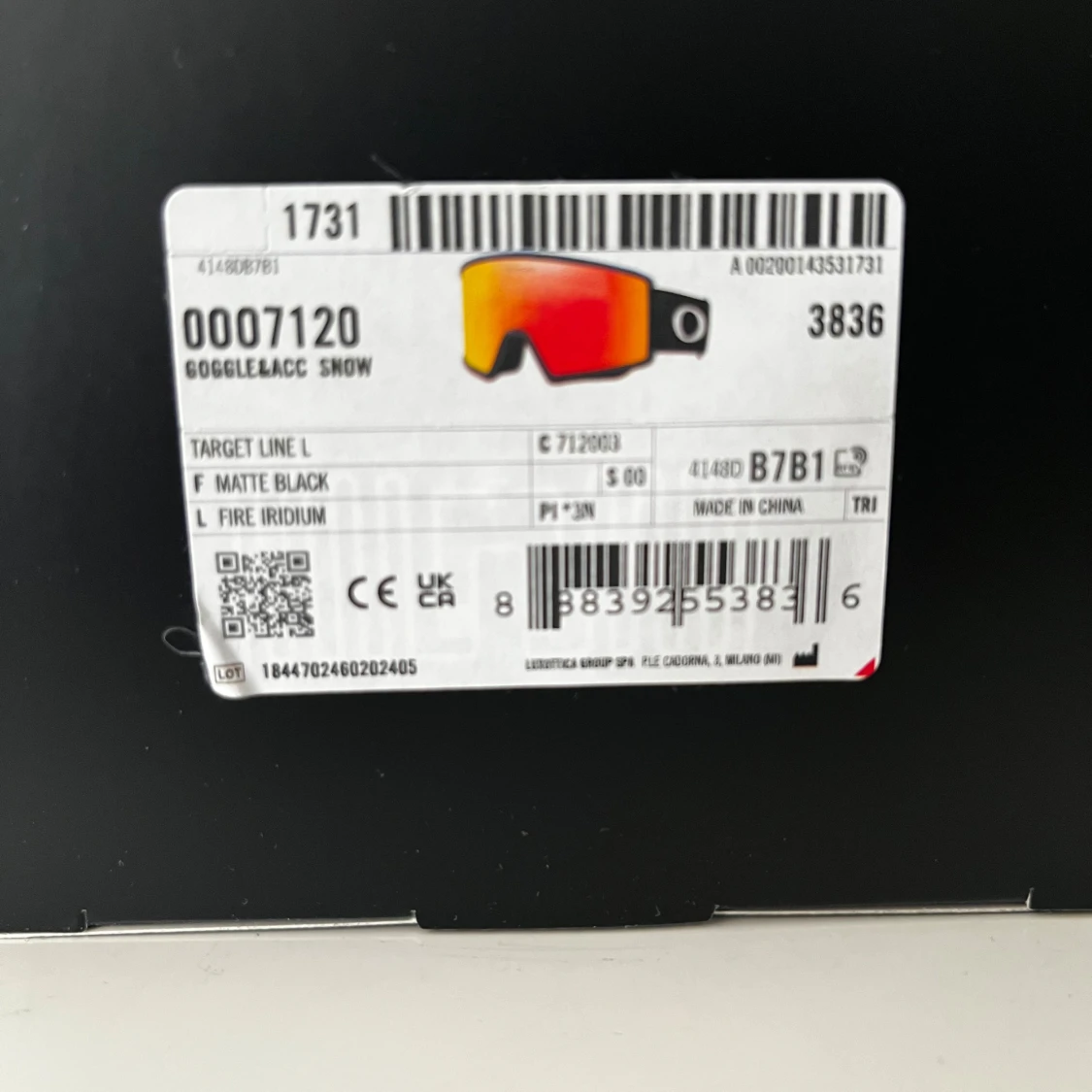 Säljer ett par Oakley Target Line L skidglasögon med Fire Iridium-lins. Glasögonen har en cool, rektangulär form och mattsvart ram med bred svart rem och vit Oakley-logga. Linsen är spegelblank i orange och rött, perfekt för snö och soliga dagar i backen.