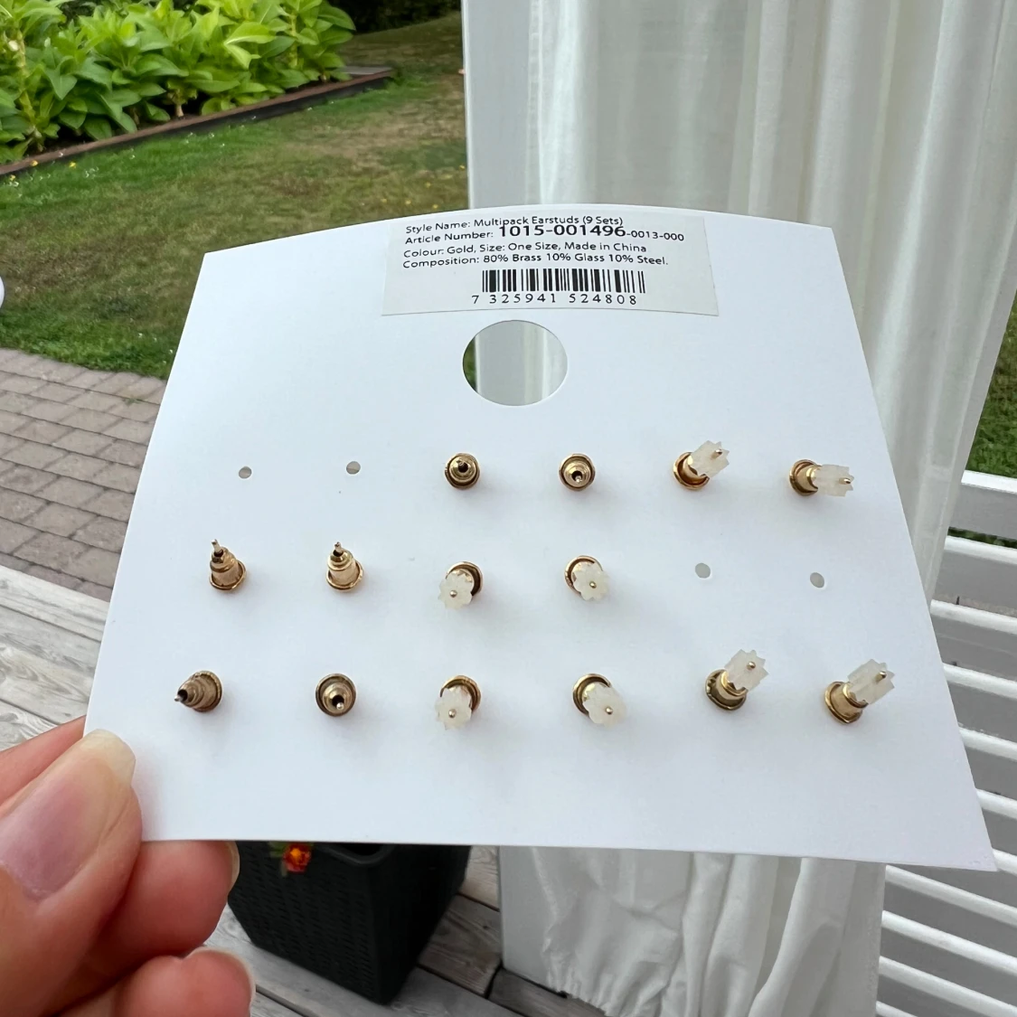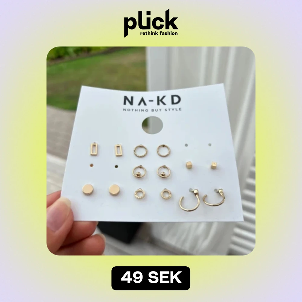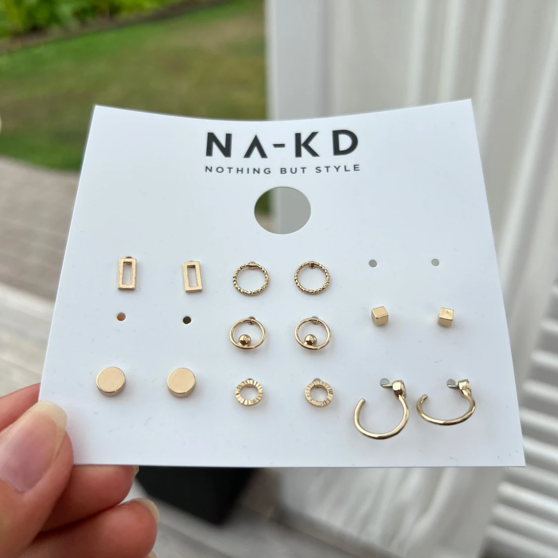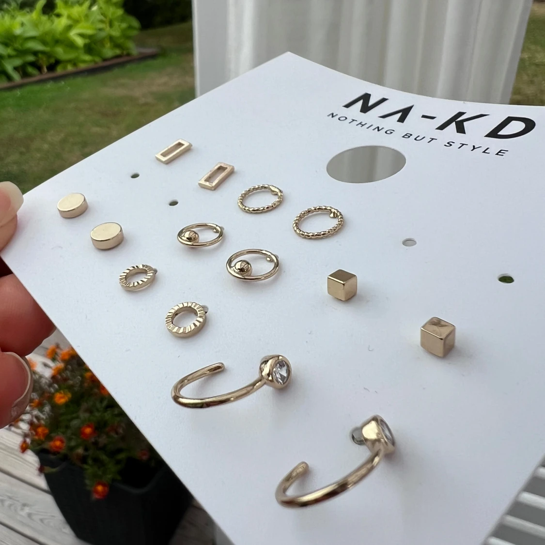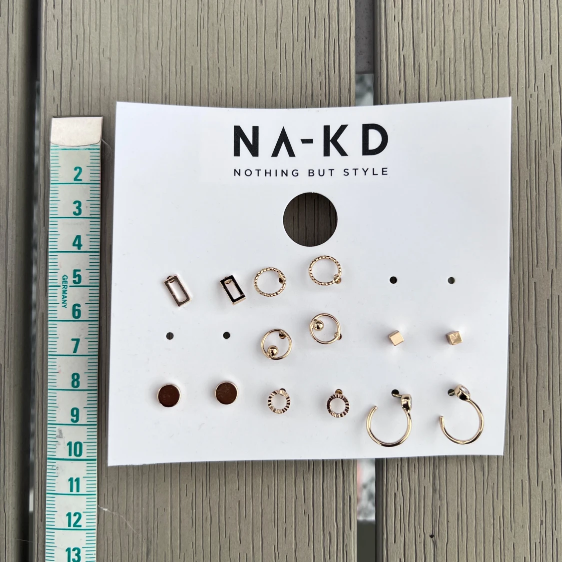En karta med örhängen från NA-KD. 7 av 9 par kvar (vet ej var de resterande 2 tagit vägen) Gjorda av mässing, glas och stål. (ALDRIG ANVÄNDA)