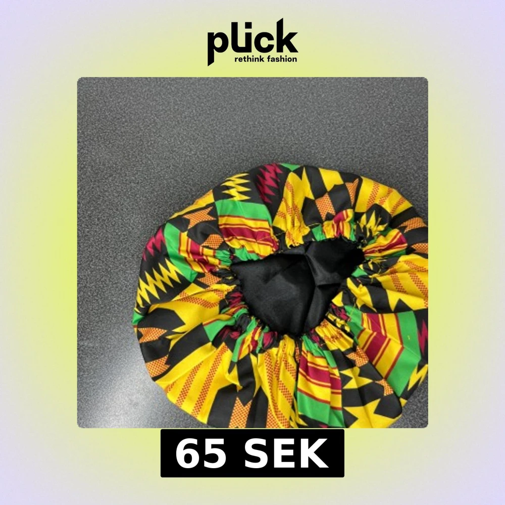 färgstark hår bonnet med elastisk kant. Bonneten har ett afrikanskt inspirerat mönster i gult, grönt, rött och svart. Perfekt för att skydda håret under natten eller som statement-accessoar. Mjuk insida i svart satin för extra komfort.
