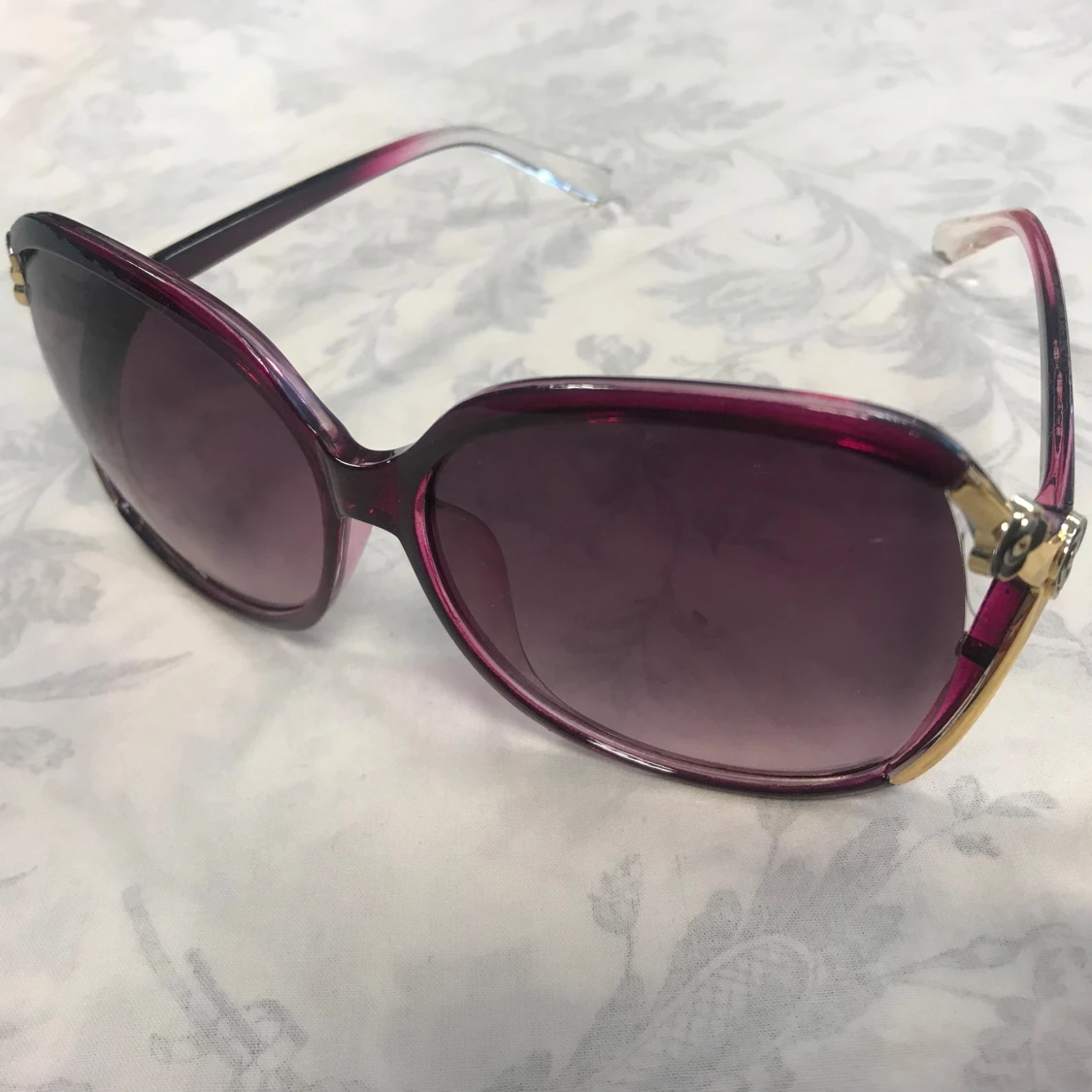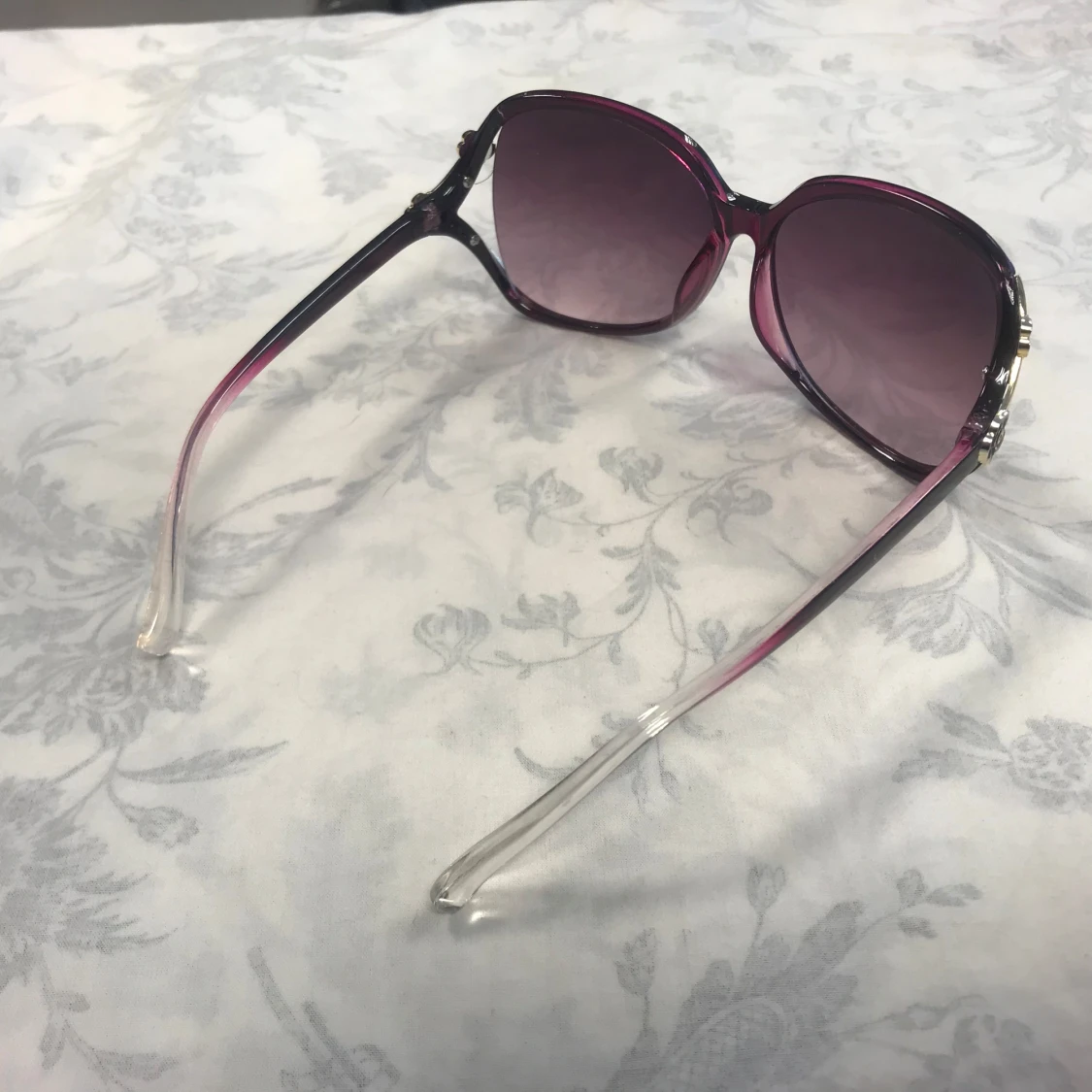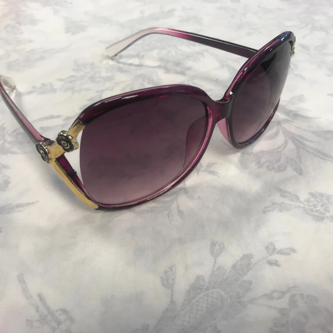 Snygga oversized solglasögon i lila / rosa med mörka glas och guldfärgade detaljer vid bågarna. Bågarna har en mjuk övergång från lila till transparent längst ut. Perfekt accessoar för att sticka ut i solen.