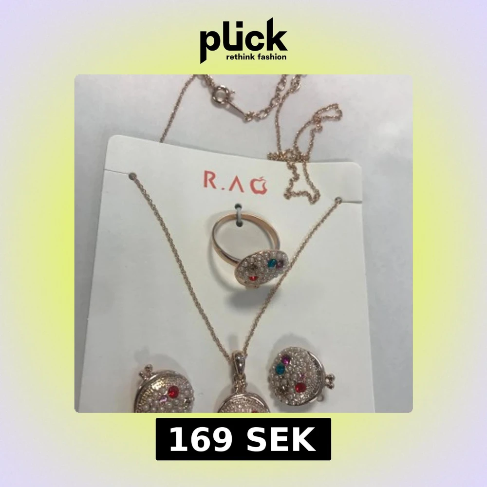 Elegant smyckeset från R.A.O med hjärtformade detaljer. Setet inkluderar ett halsband, ett par örhängen och en ring, alla dekorerade med små pärlor. Perfekt för att ge en romantisk touch till din stil. 169kr/paket, helt ny