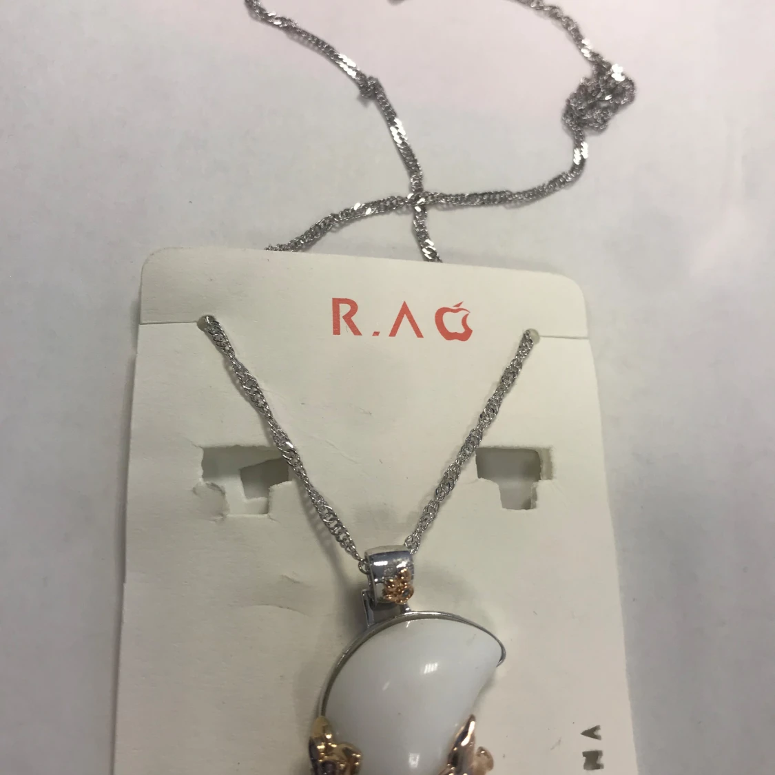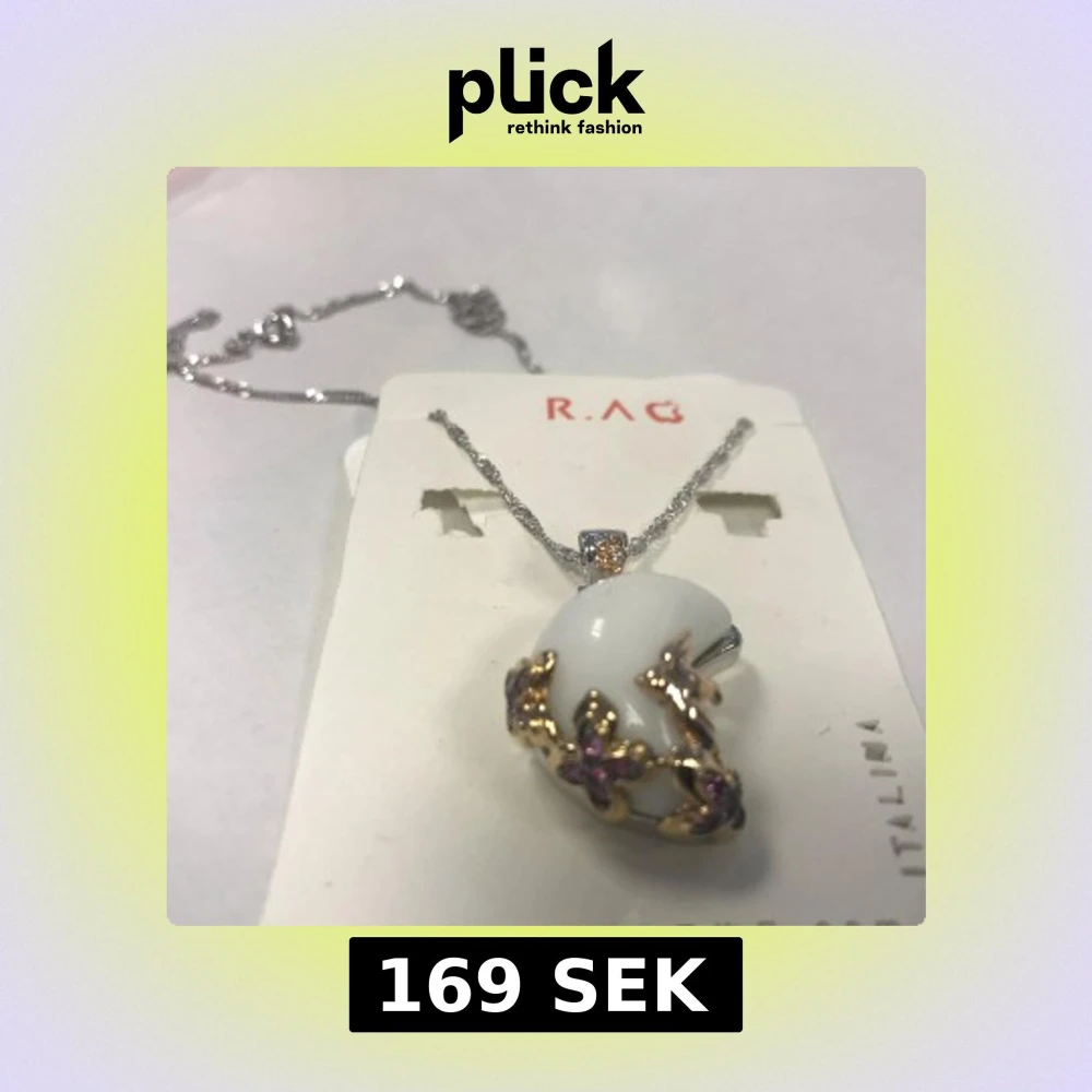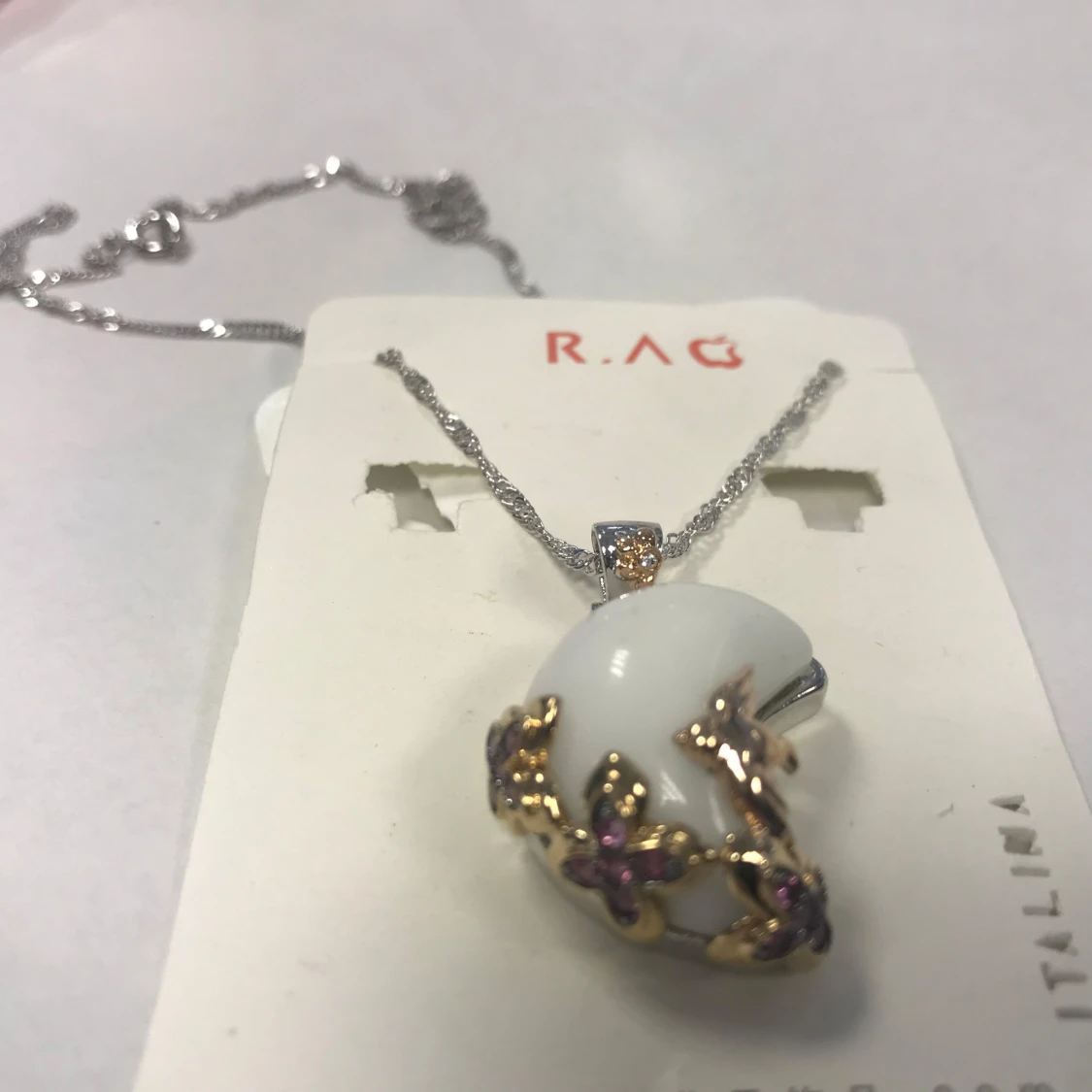 Elegant halsband från R.A.G med en vit berlock dekorerad med guldfärgade detaljer och små lila stenar. Kedjan är silverfärgad och har en fin glans. Perfekt för att ge en touch av lyx till din outfit. Helt ny