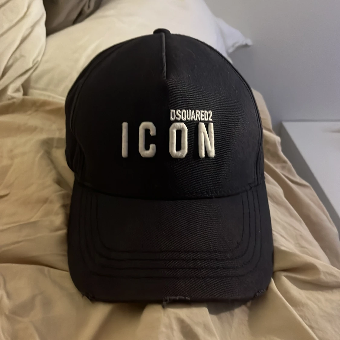 Säljer en svart keps från Dsquared2 med texten 'ICON' broderad framtill. Kepsen har en justerbar rem baktill och är i mycket bra skick. Perfekt för att ge din outfit en cool touch! 🖤