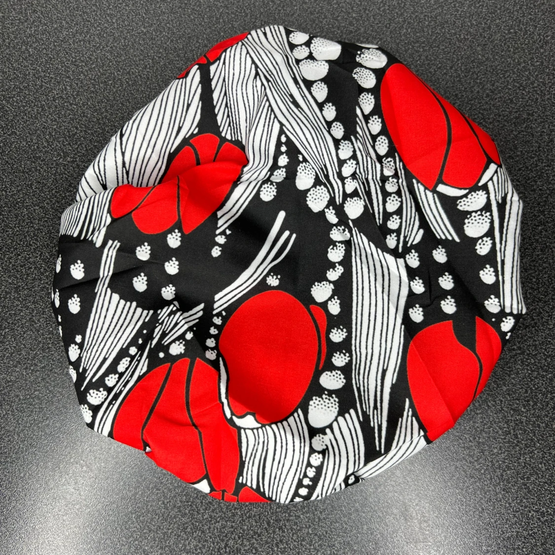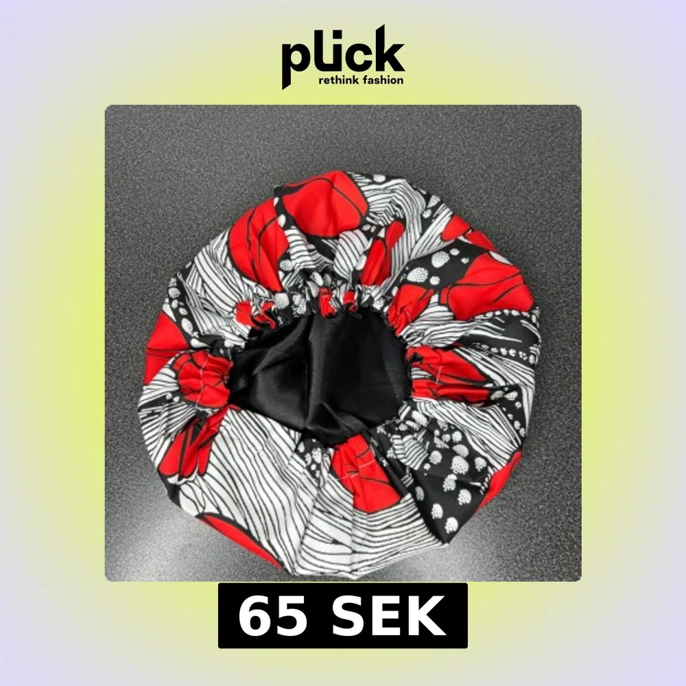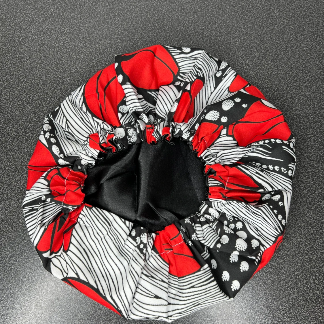 Snygg satinbonnet med elastisk kant och coolt grafiskt mönster i rött, svart och vitt. Utsidan har stora röda former och vita linjer på svart botten, insidan är slät svart satin som skyddar håret. Perfekt för att hålla frisyren på plats under natten.