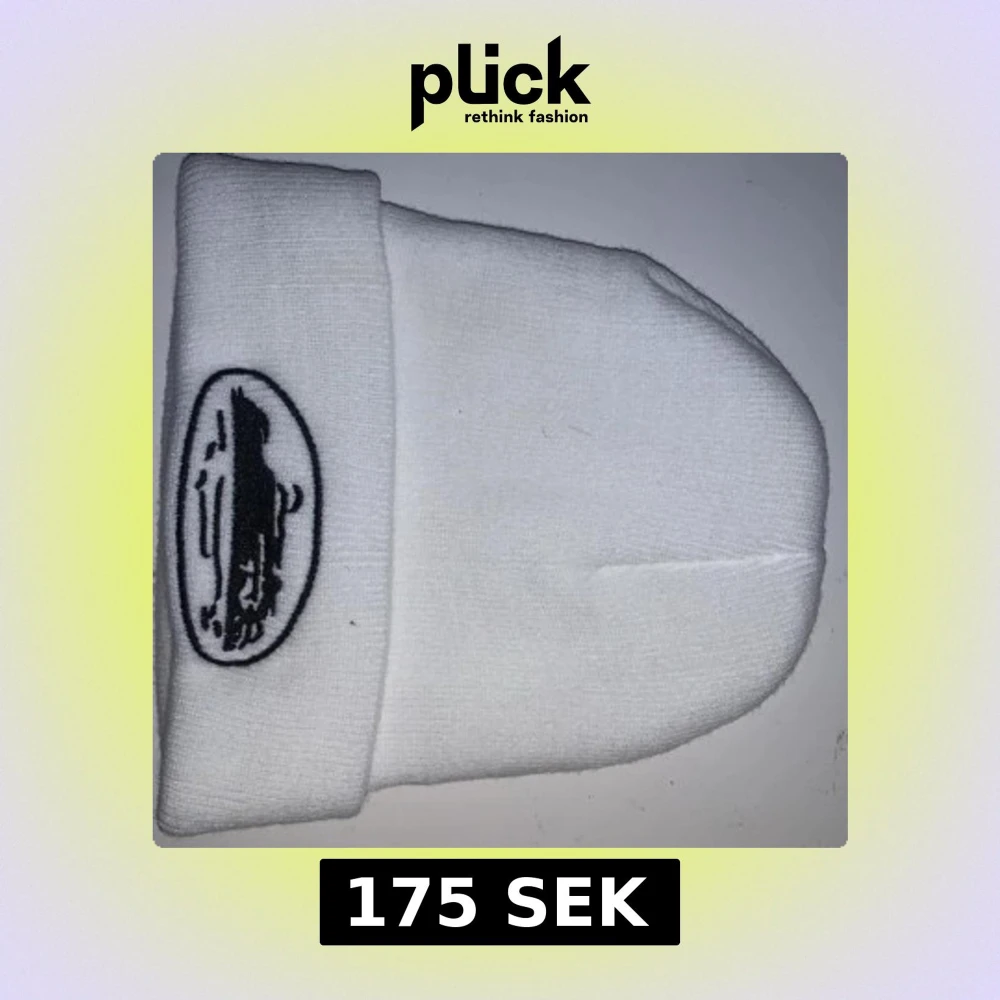 Snygg vit stickad mössa med en broderad svart logga framtill. Perfekt för att hålla värmen under kyliga dagar. Enkel och stilren design som passar till det mesta.