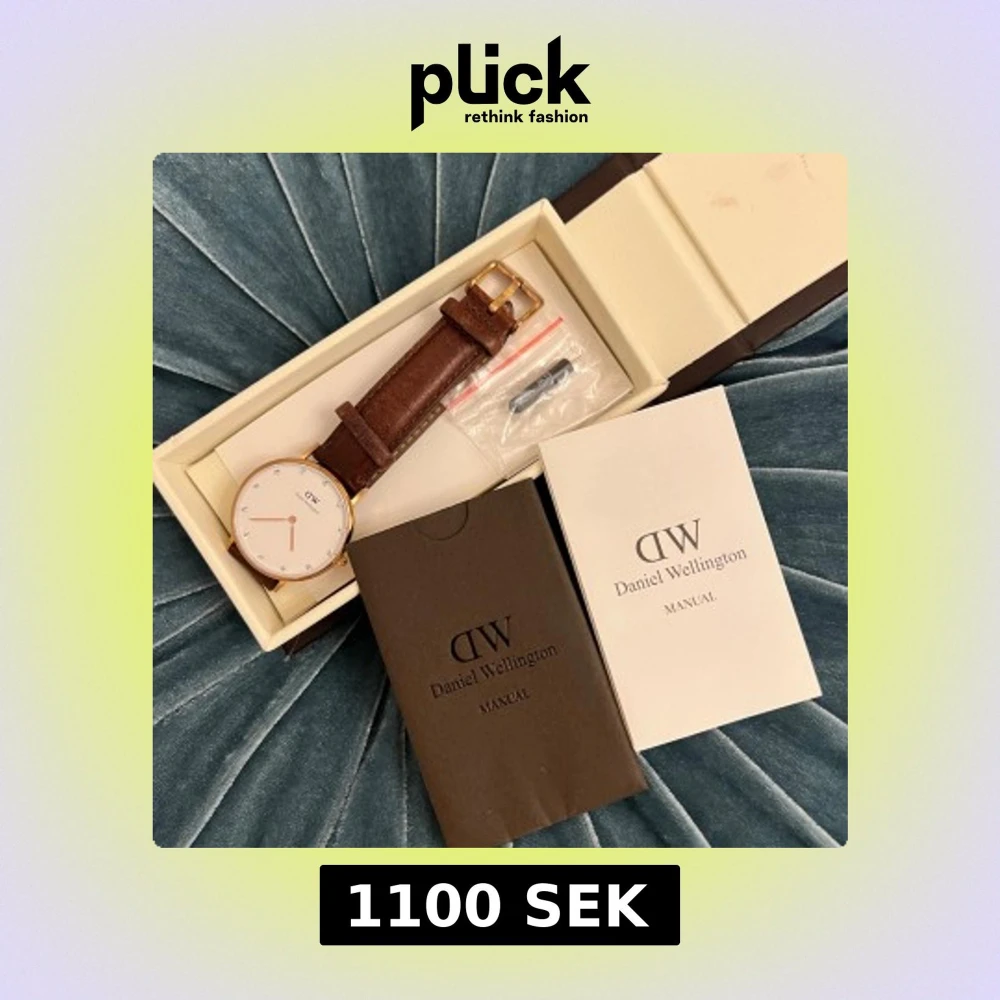 Snygg klocka från Daniel Wellington med rund vit urtavla, guldiga detaljer och kristallmarkeringar. Remmen är i brunt skinn med guldspänne. Stilren och klassisk design som passar perfekt till dig som gillar enkla men eleganta accessoarer. Klockan är i gott skick kosmetiskt. Batteriet fungerar inte just nu, så den behöver ett nytt för att starta.
