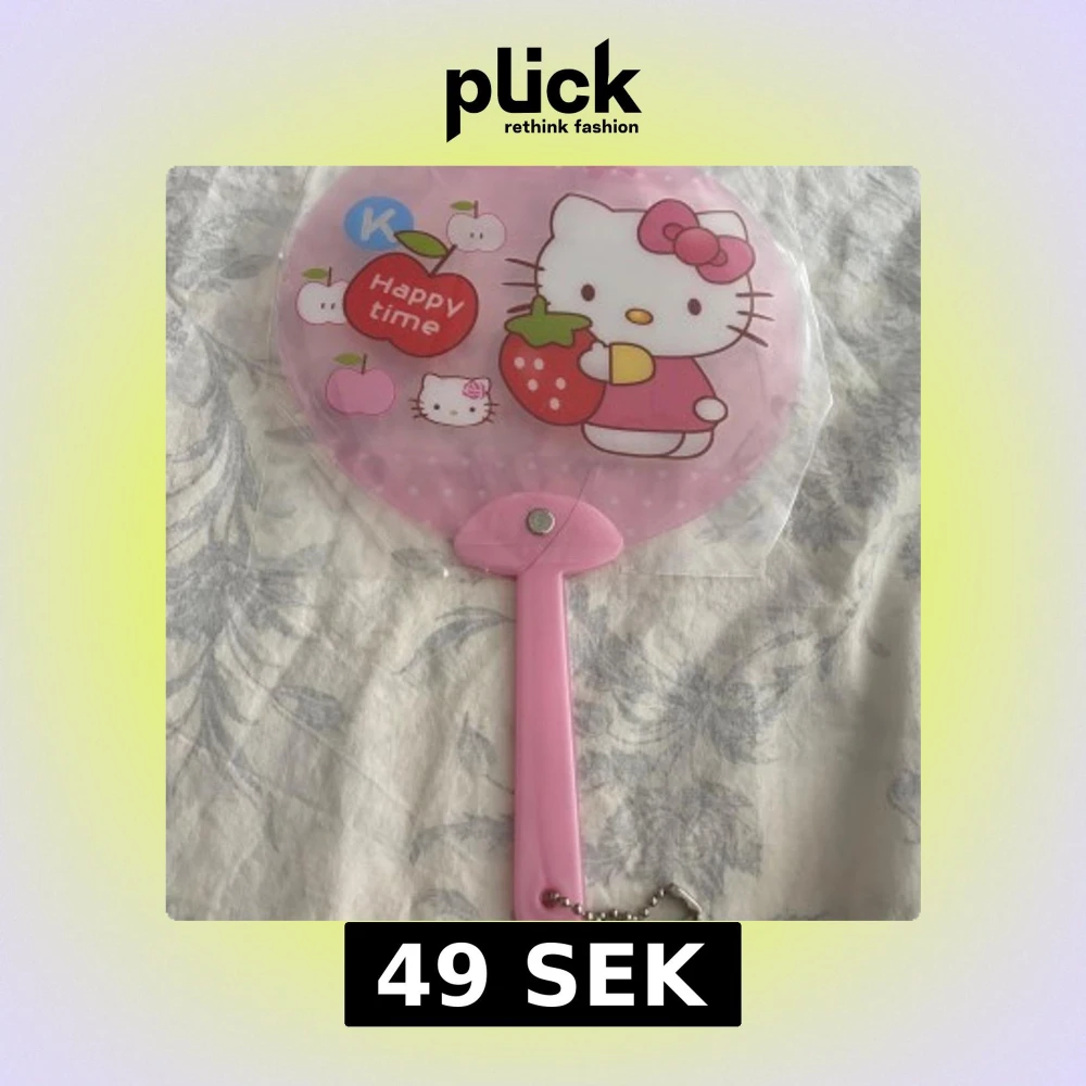 Söt rosa solfjäder med Hello Kitty-motiv. Fjädern har olika tryck med Hello Kitty, jordgubbar, rosetter och blommor. Handtaget är ljusrosa plast med liten kedja. Perfekt accessoar för att hålla sig sval och visa din kärlek till Hello Kitty. Ny 49kr/st