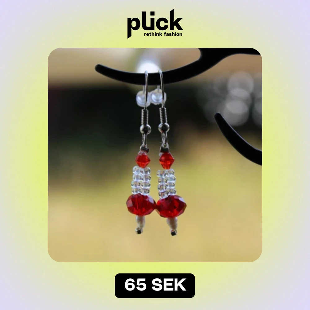 Säljer ett par snygga örhängen med röda och klara pärlor. De har en elegant design med två röda pärlor och flera klara pärlor som ger en fin kontrast. Perfekta för att piffa upp din outfit till fest eller andra speciella tillfällen.