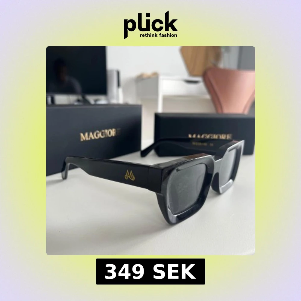 Stilrena svarta solglasögon från Maggiore med rektangulära bågar och mörka glas. Snygg gulddetalj med logga på skalmen och robust plastmaterial. Perfekta för dig som vill ha en modern och edgy look.