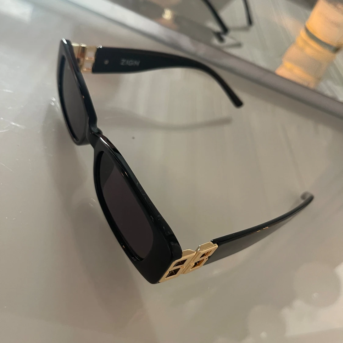 Snygga svarta solglasögon från Zign med rektangulära bågar och mörka glas. Sidorna har coola gulddetaljer som ger en lyxig känsla. Perfekt accessoar för att lyfta din stil och ge en trendig vibe.