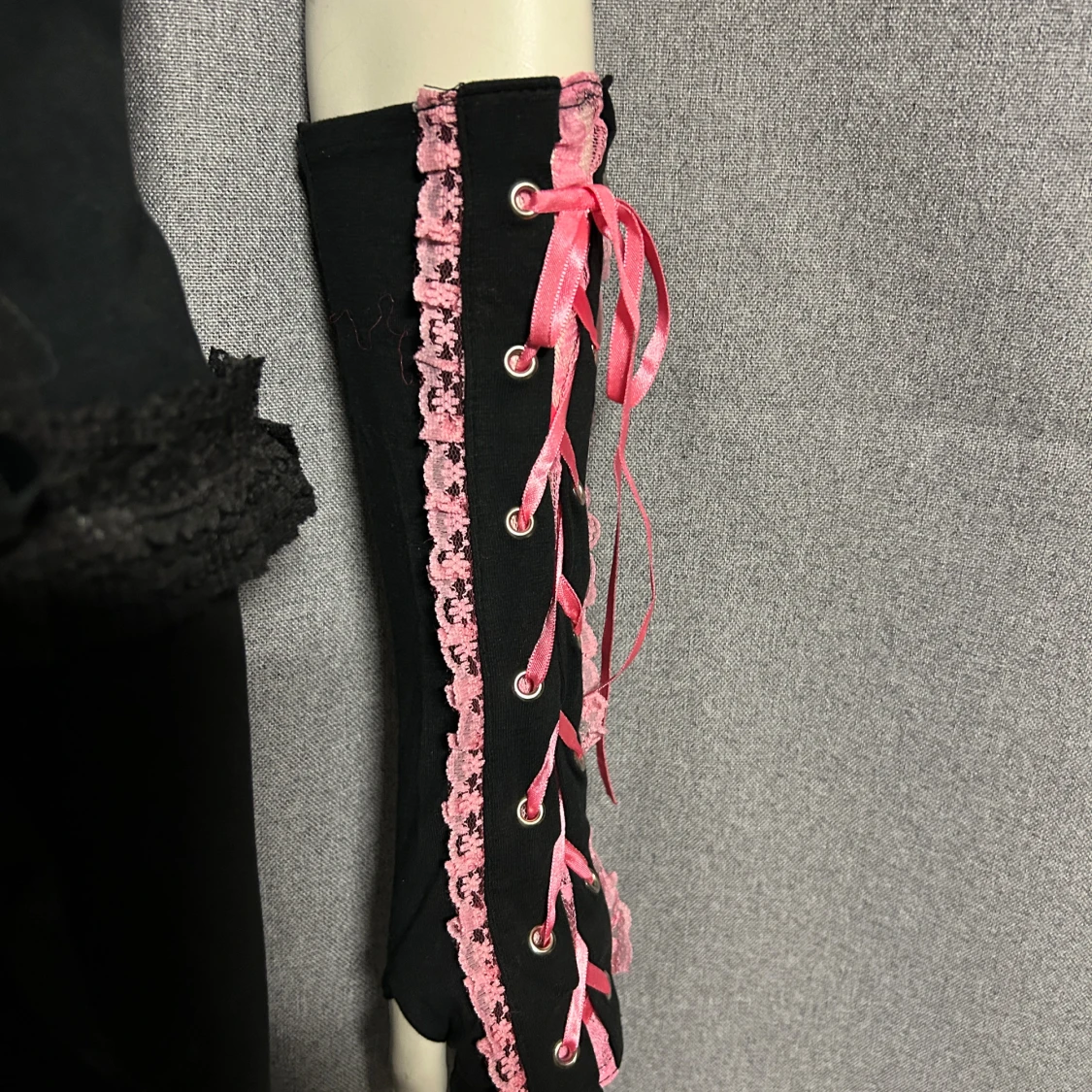 Helt nya långa handskar i stretchig bomullstrikå. Storlek onesize.