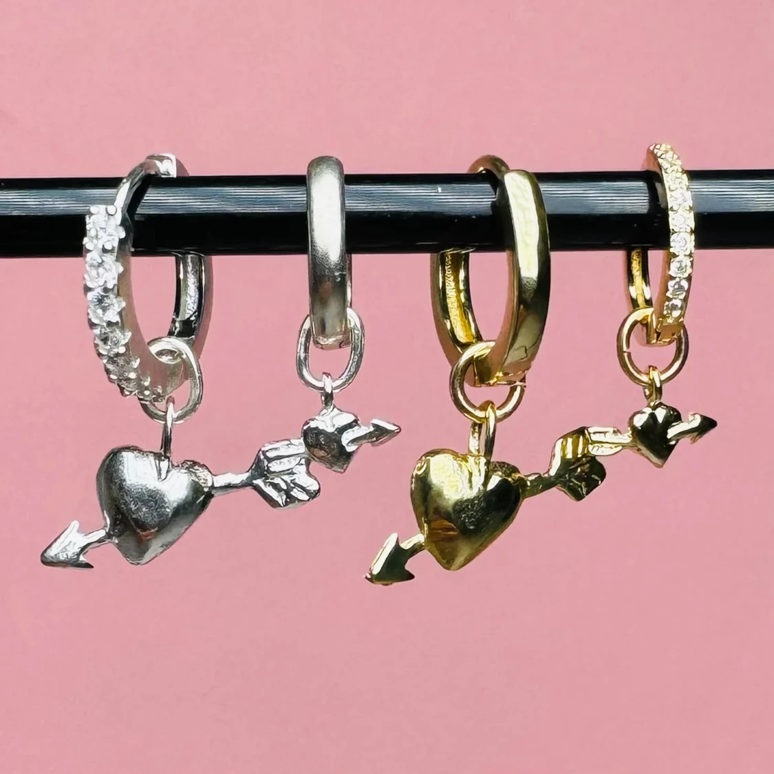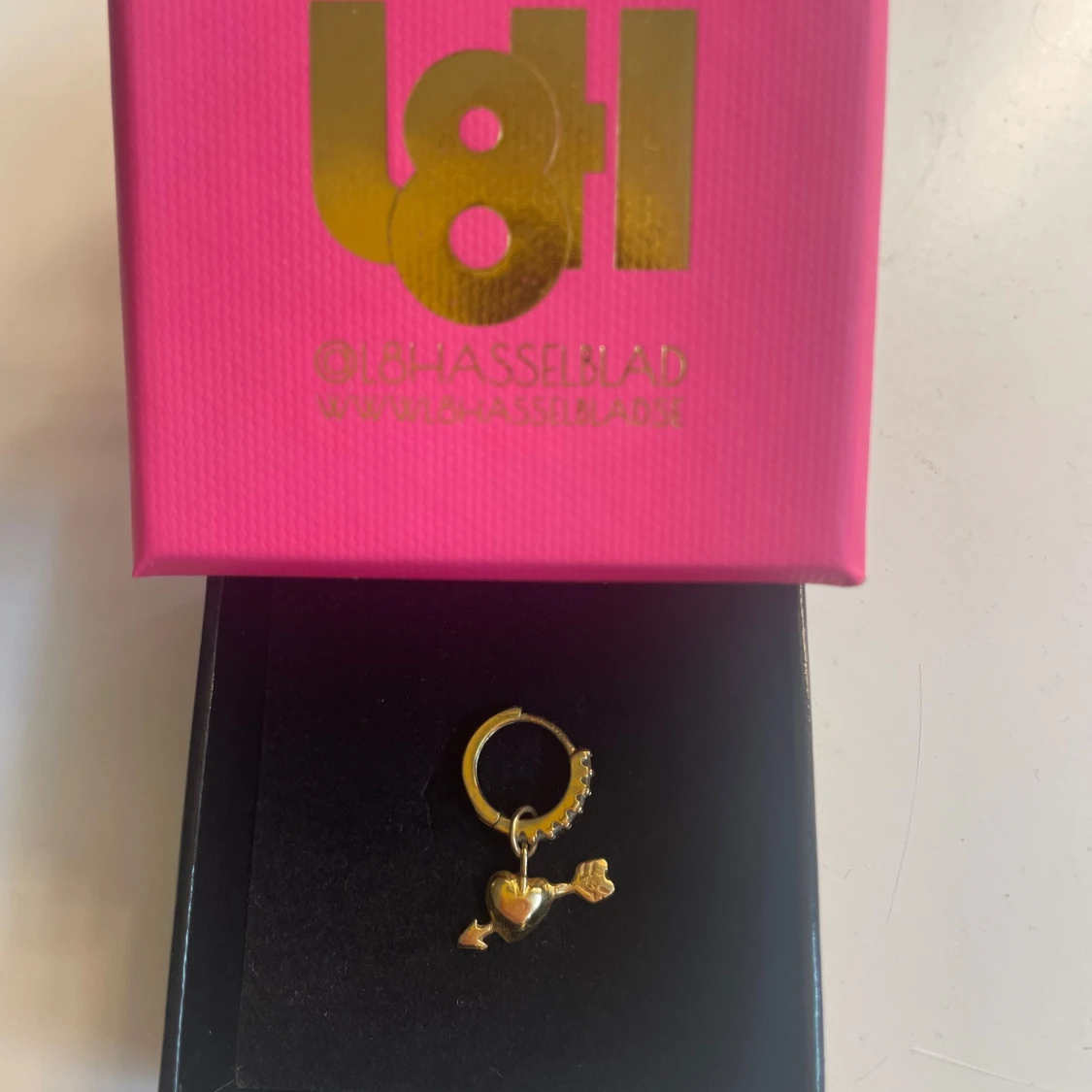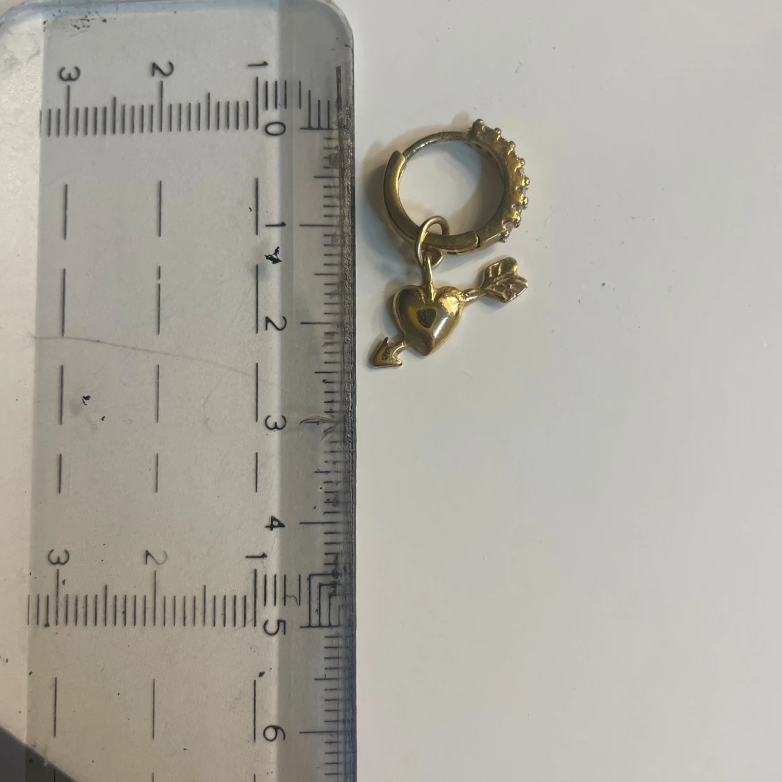 Supersött guldpläterat örhänge från L8 Hasselblad med ett hängande hjärta genomborrat av en pil. Ringen är dekorerad med små gnistrande stenar för extra bling. Perfekt accessoar för dig som vill sticka ut med en lekfull och trendig detalj. Kommer med asken🥰